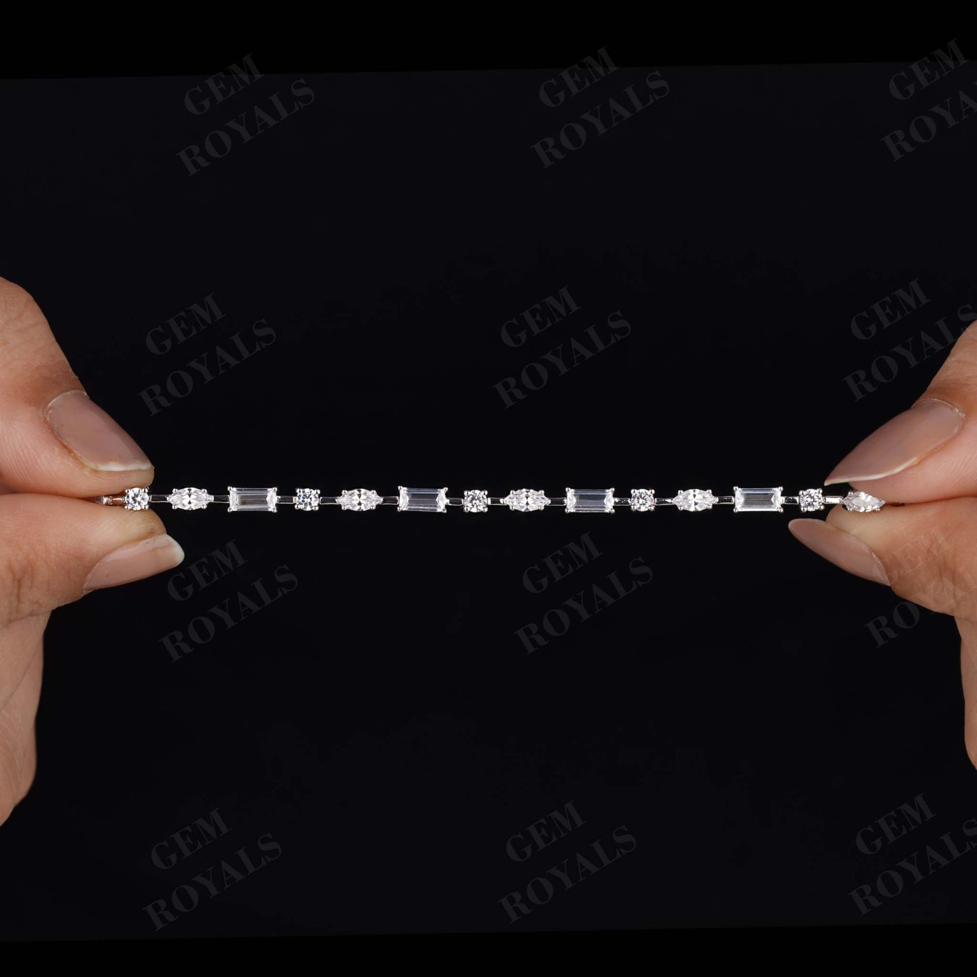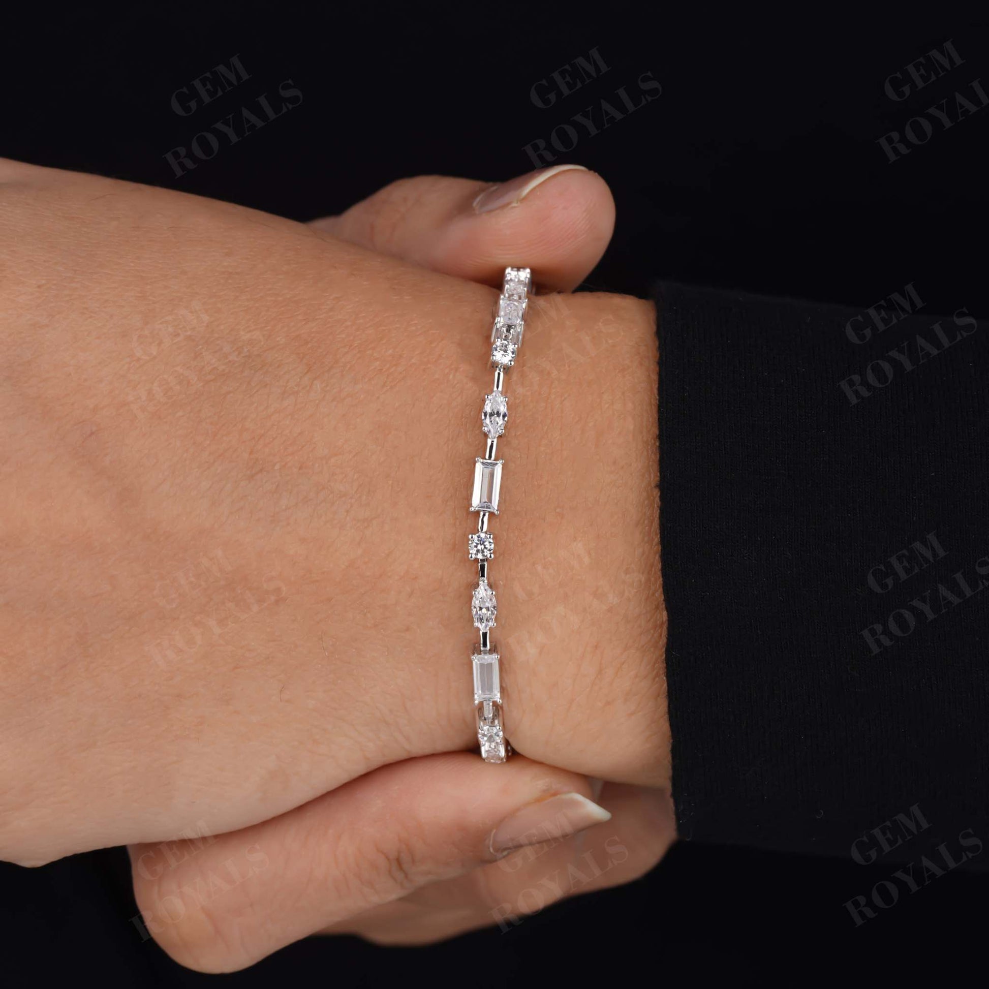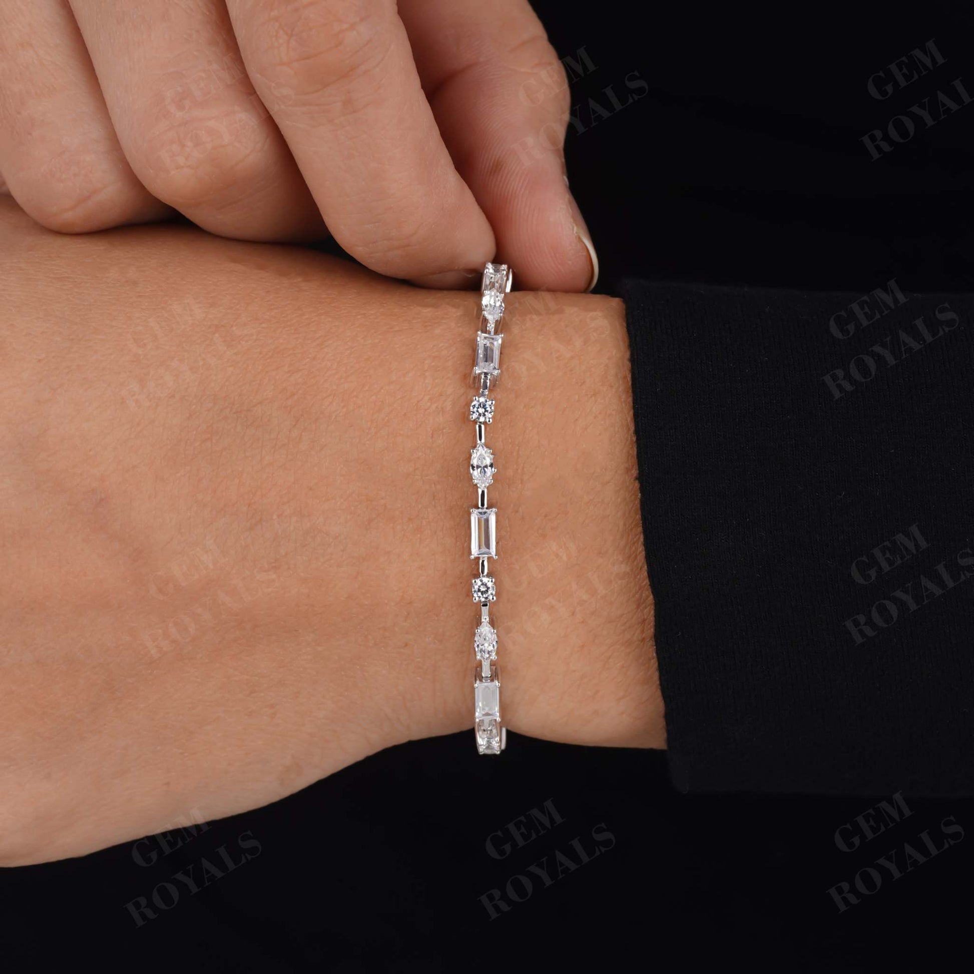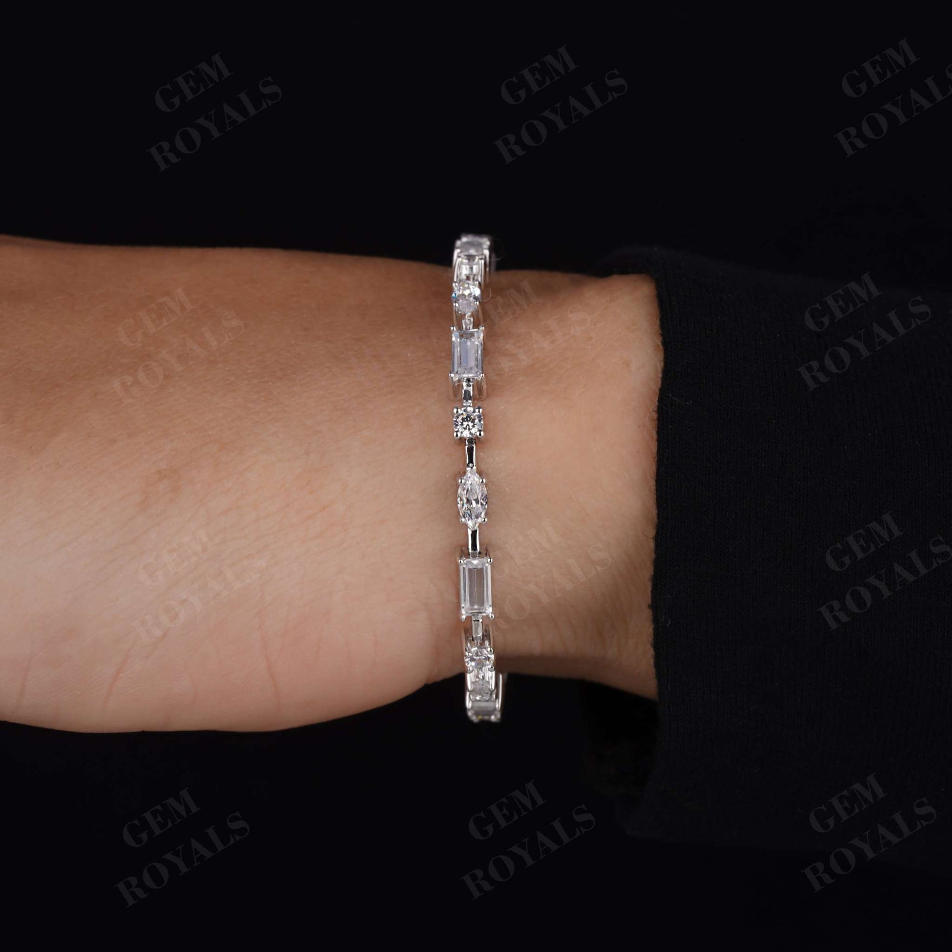 Elevate your elegance with our stunning Multi-Shape Diamond Bracelet, a captivating blend of Baguette, Marquise, and Round-cut Moissanite stones set in lustrous 14K Gold. Perfect for every occasion, it's a timeless piece that exudes sophistication and grace. Whether it's a bridesmaid gift, bridal adornment, or an anniversary token, this CZ tennis bracelet is a symbol of everlasting beauty. Handcrafted with care, it's a dainty yet impactful accessory, ideal for layering or as a standalone statement. Available in 10K, 14K, or 18K White/Yellow/Rose Gold, it's a cherished treasure meant to celebrate love and milestones.
