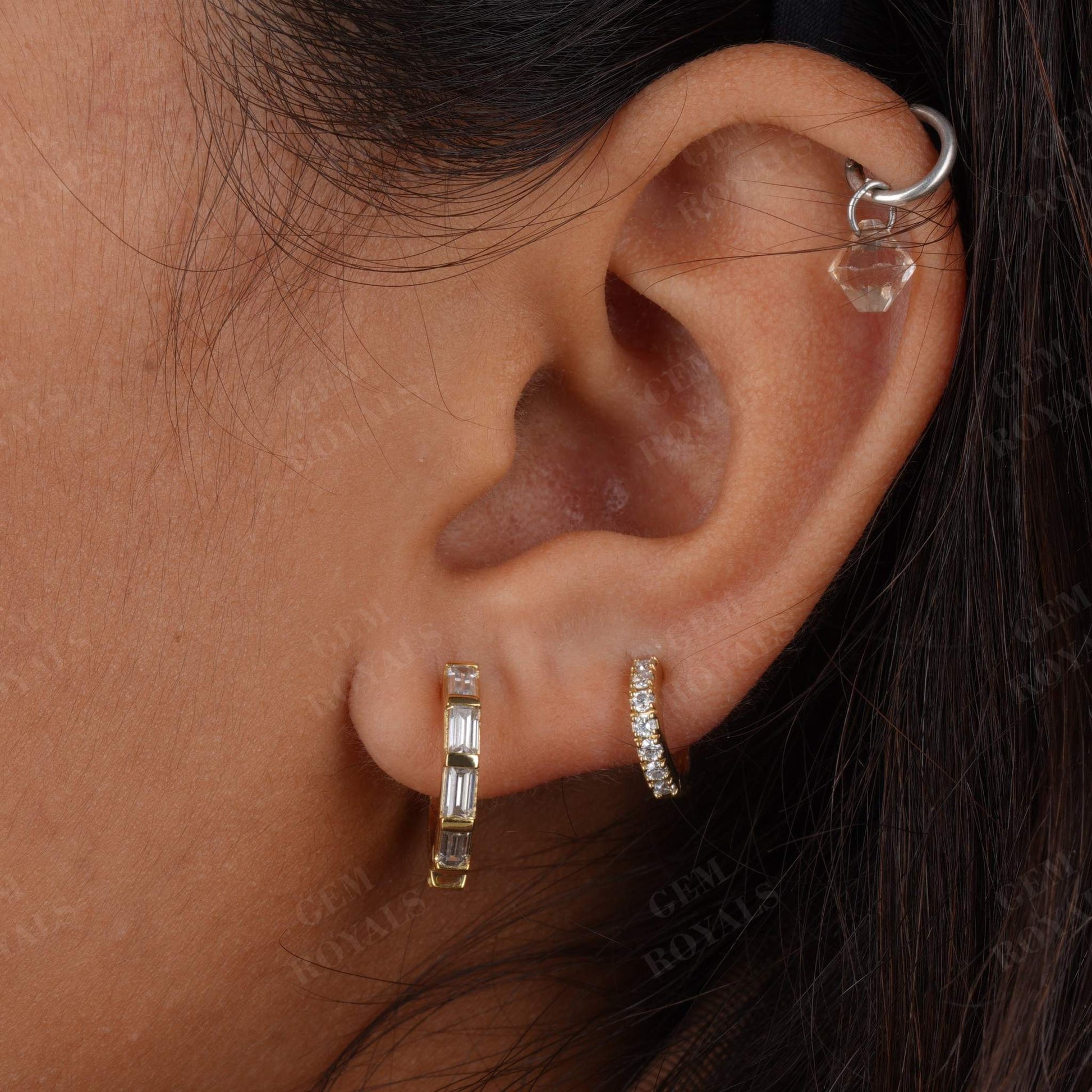 Dainty Paved Baguette Cut Moissanite Huggies Hoop Earrings