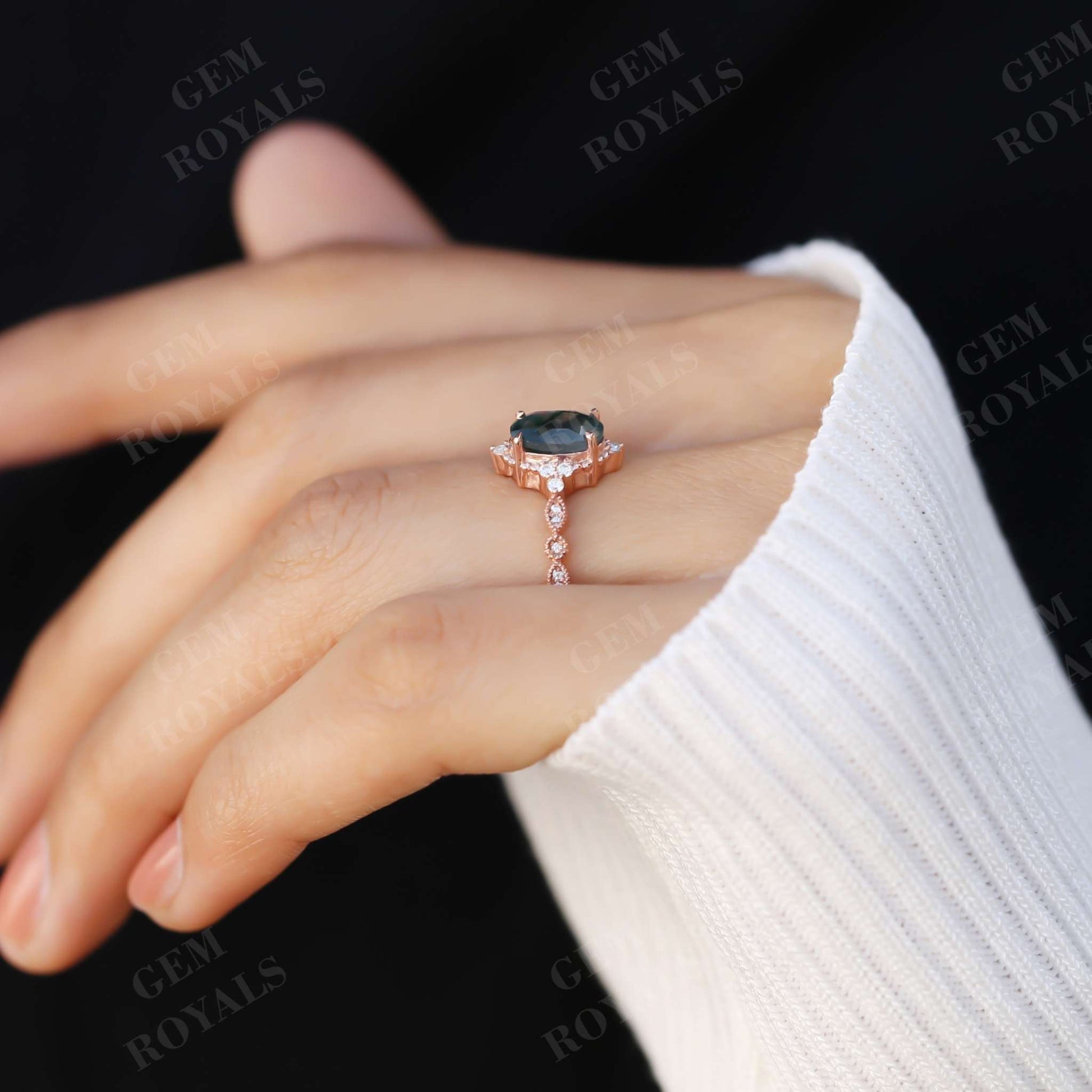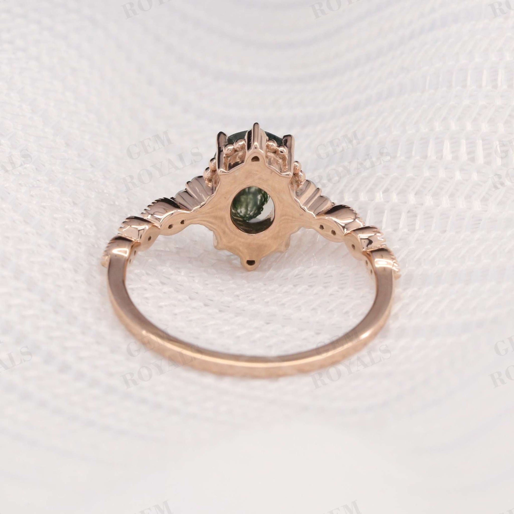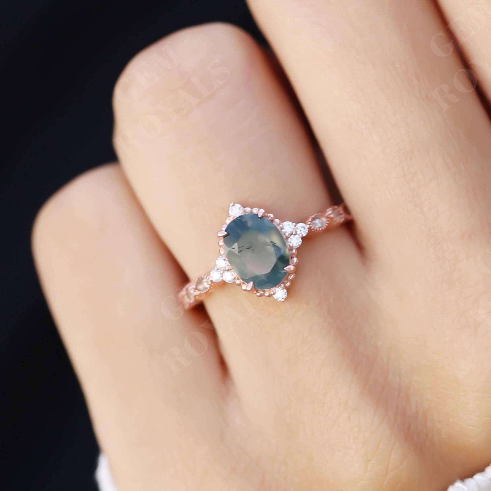 Art Deco Oval Natural Green Moss Agate Engagement Ring