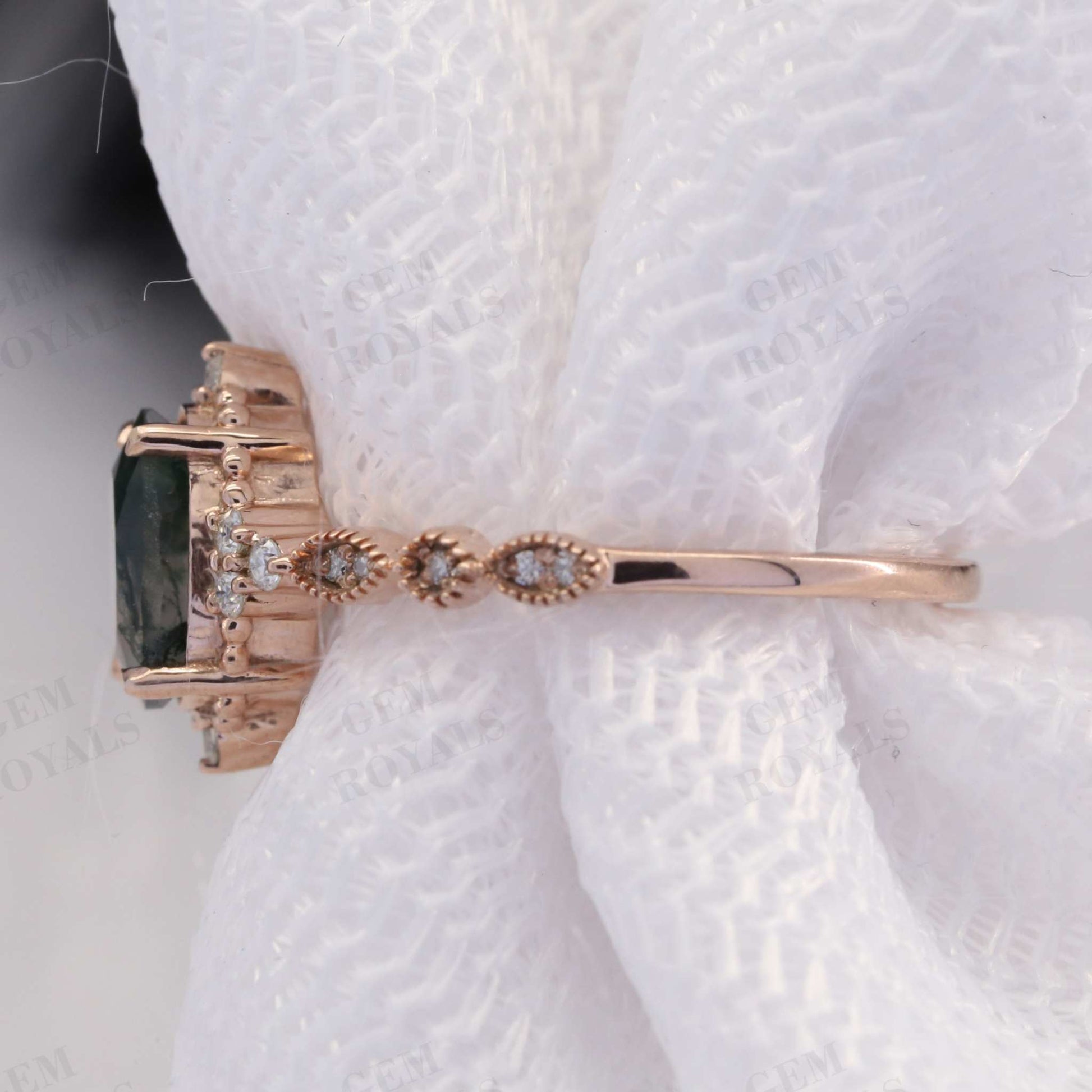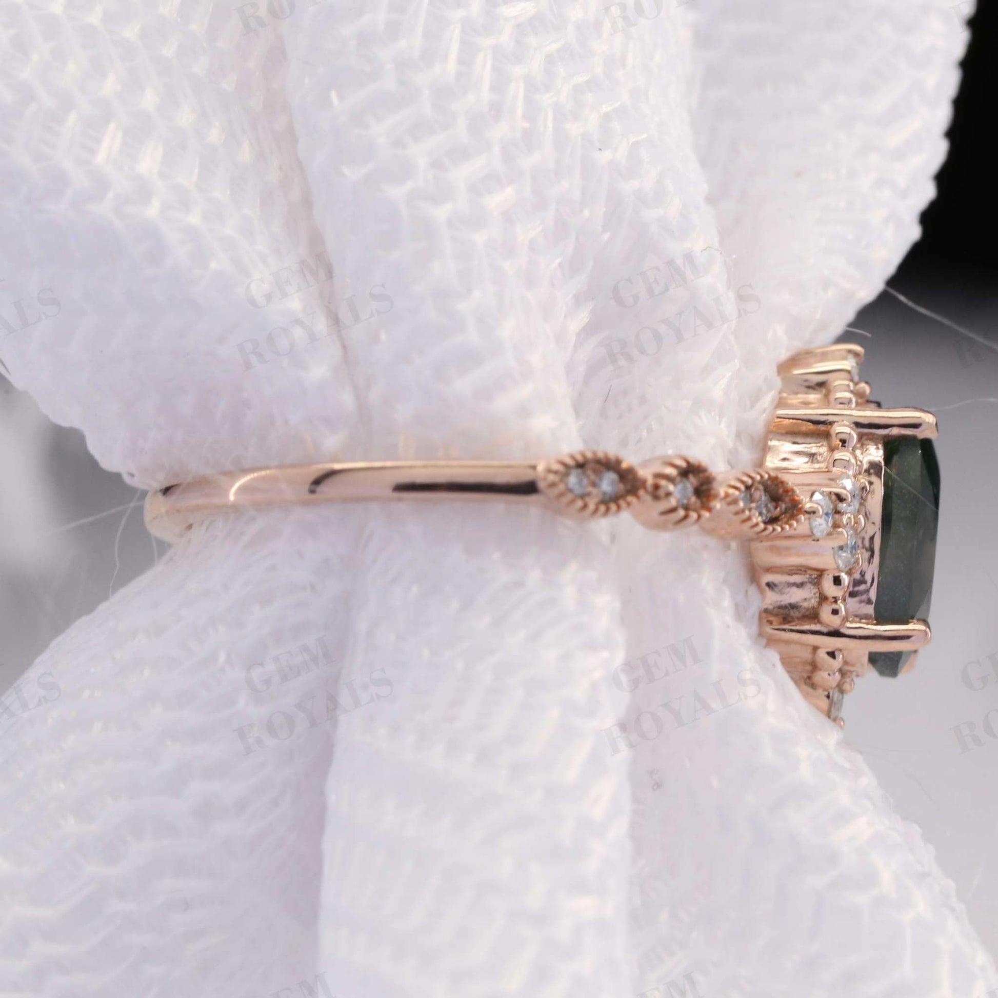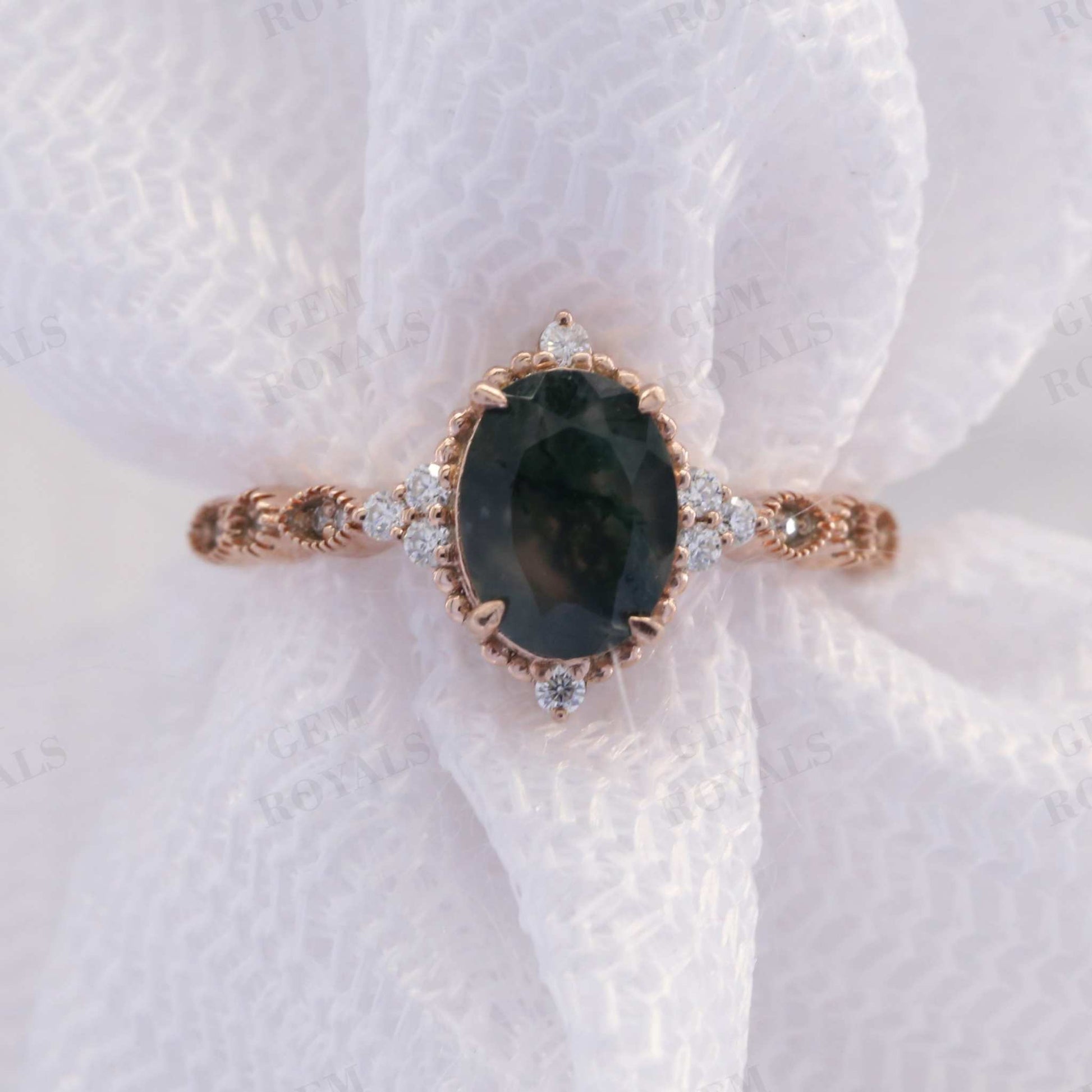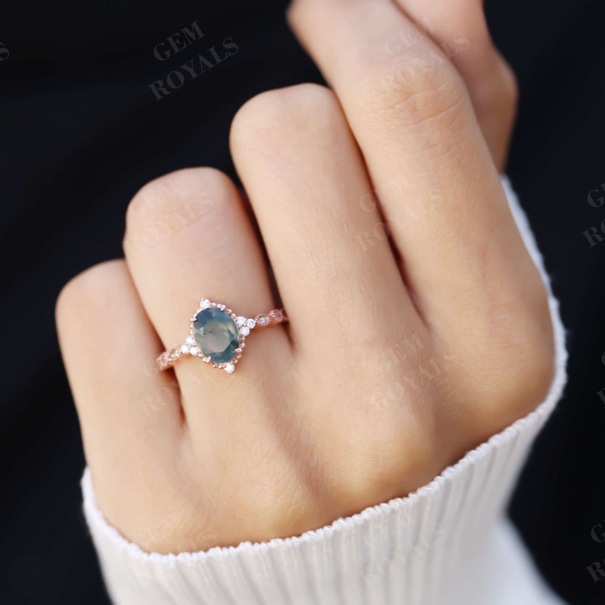 Art Deco Oval Natural Green Moss Agate Engagement Ring