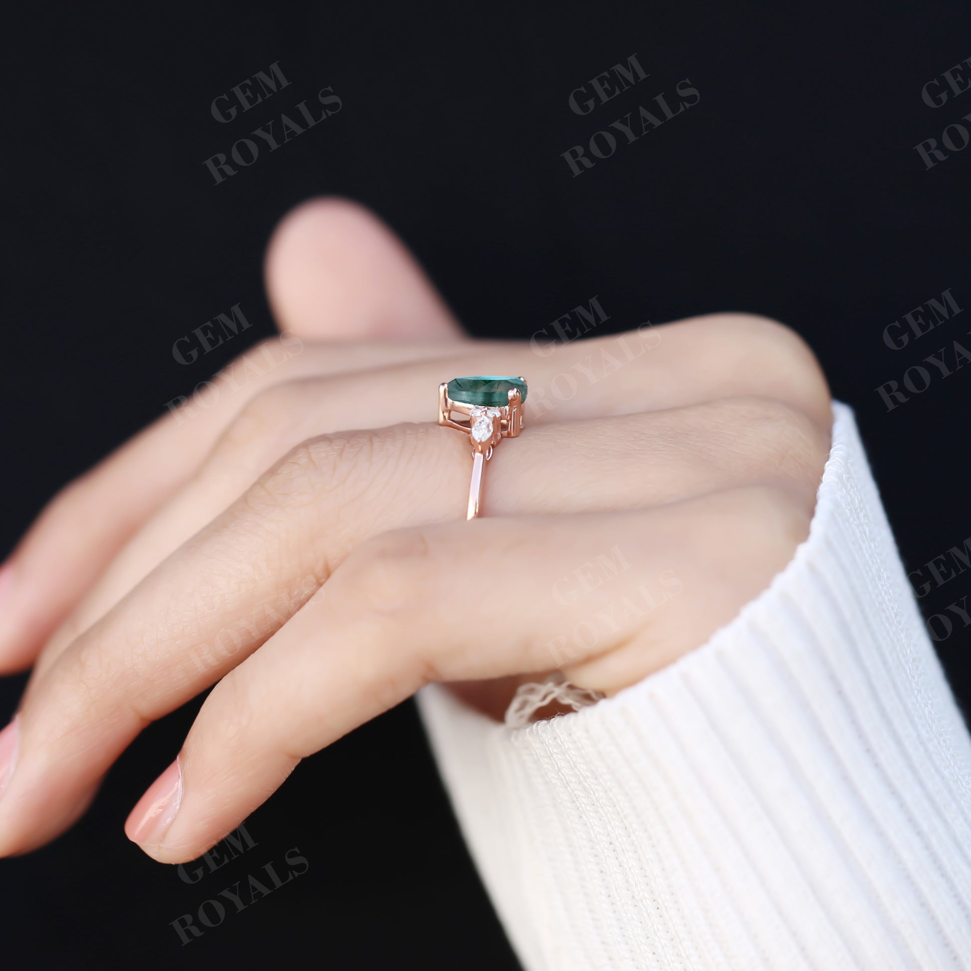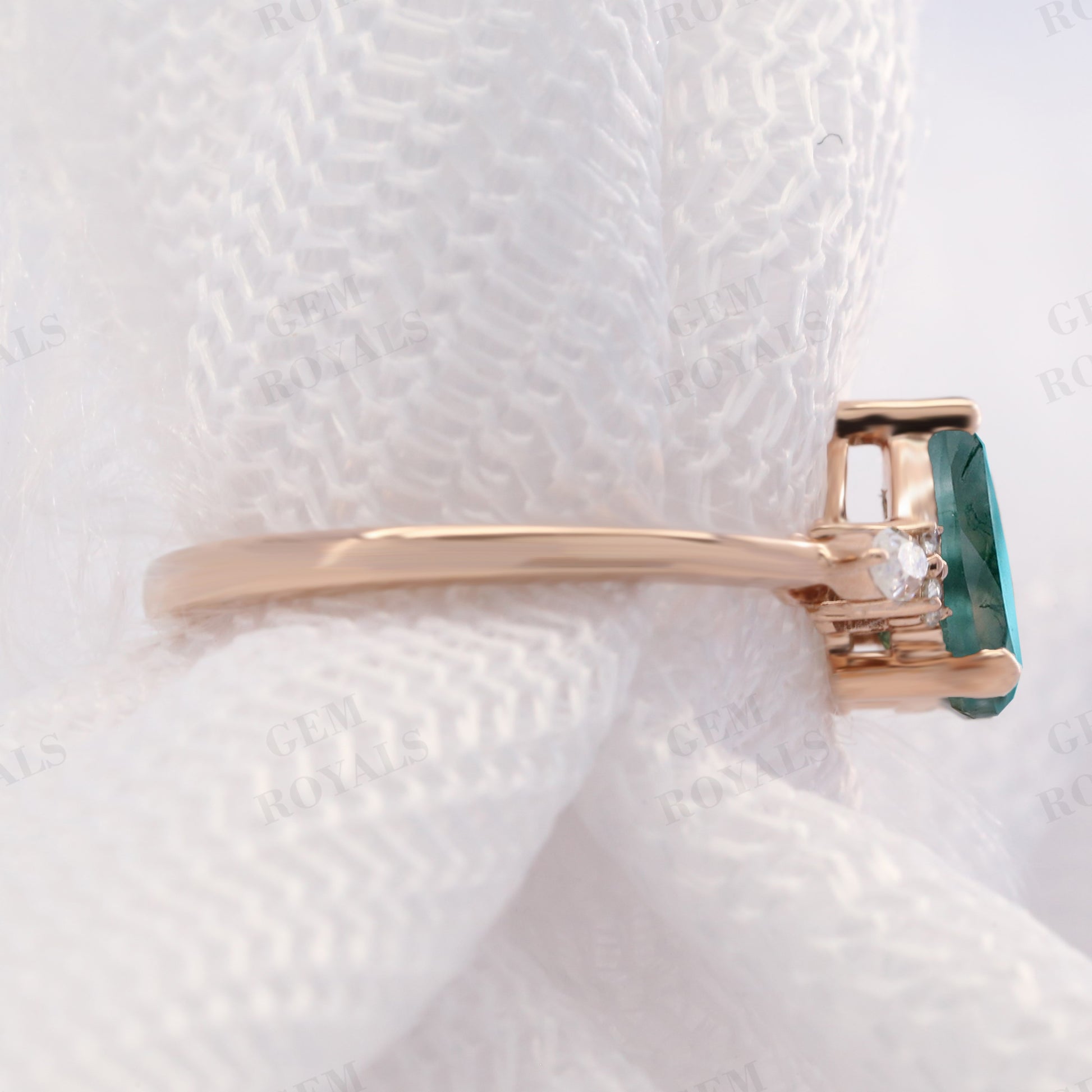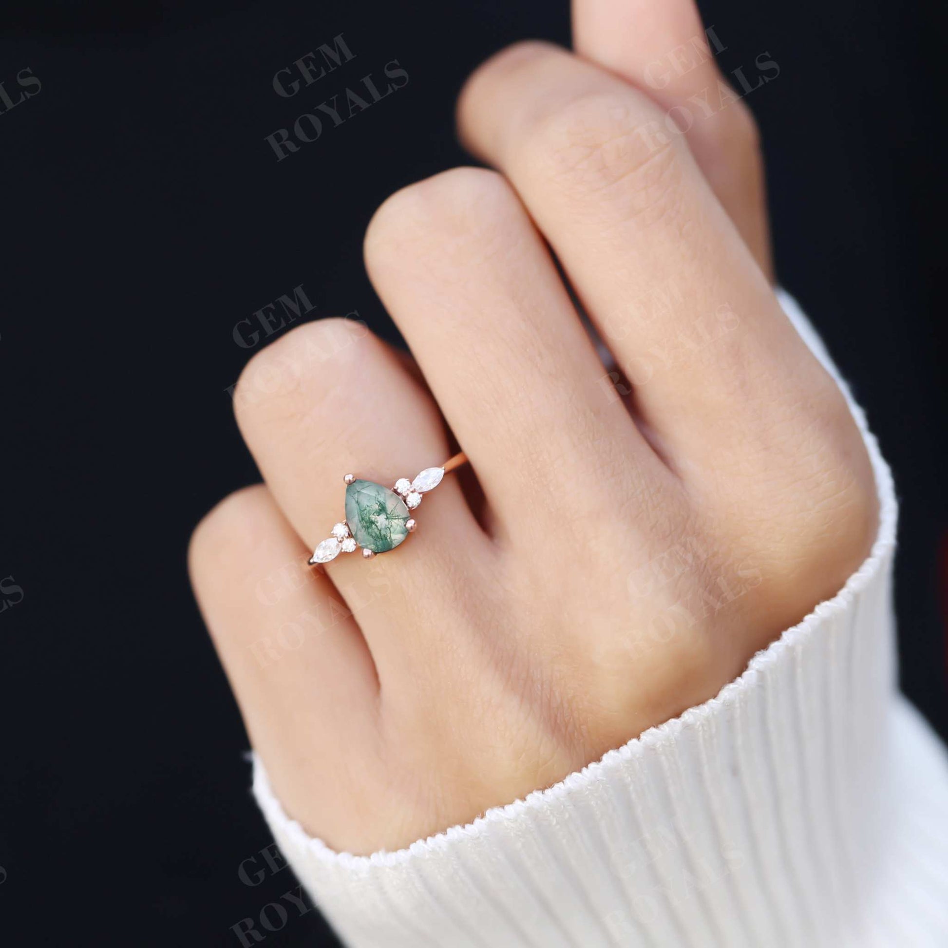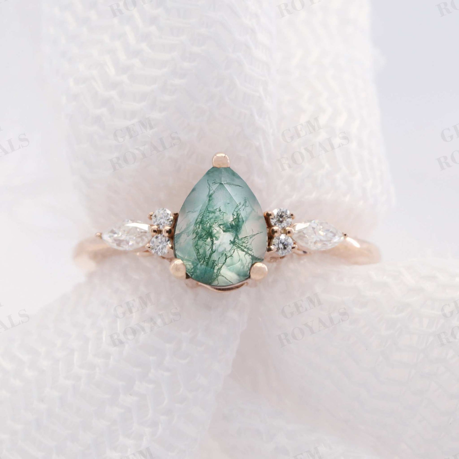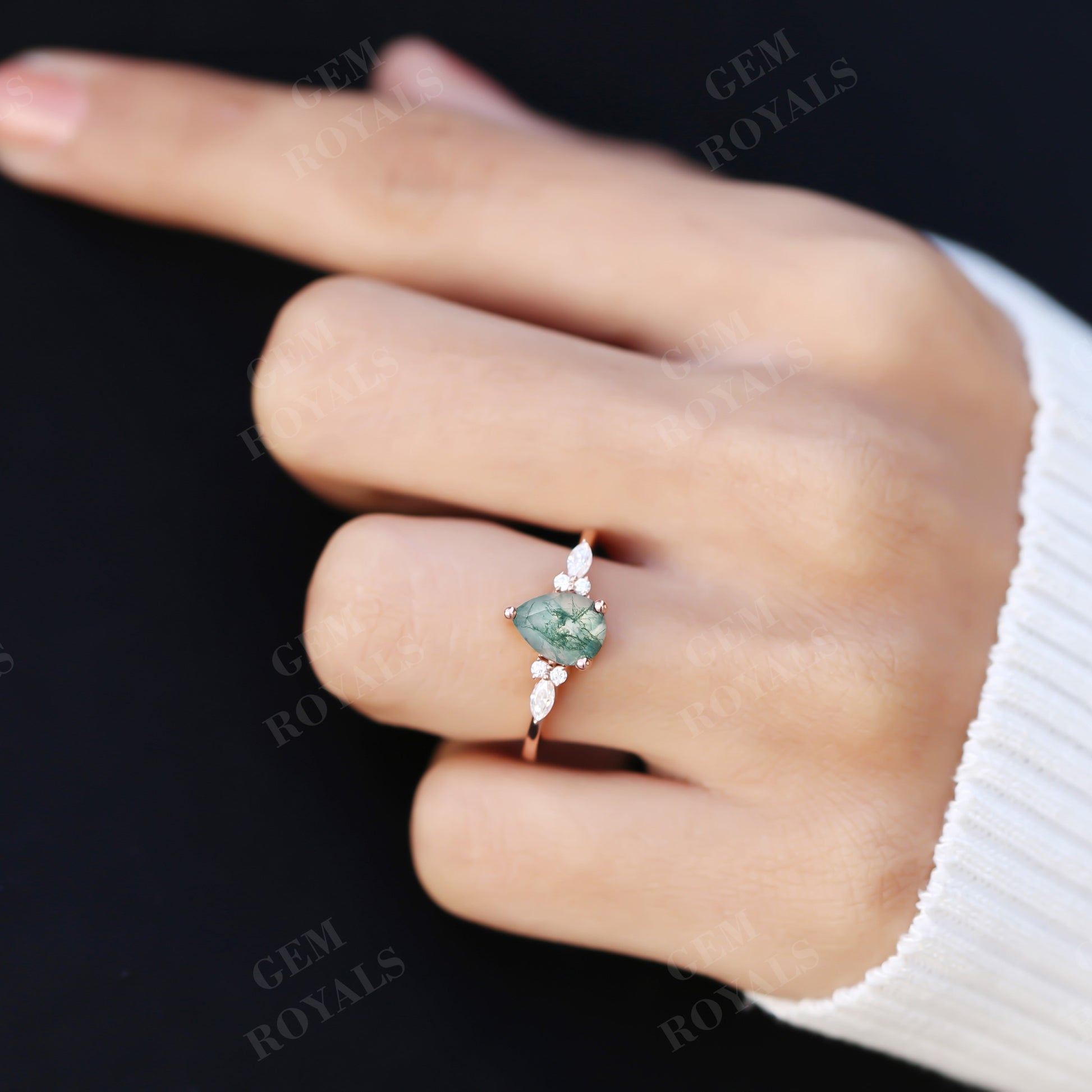 Cluster Pear Cut Natural Green Moss Agate Engagement Ring