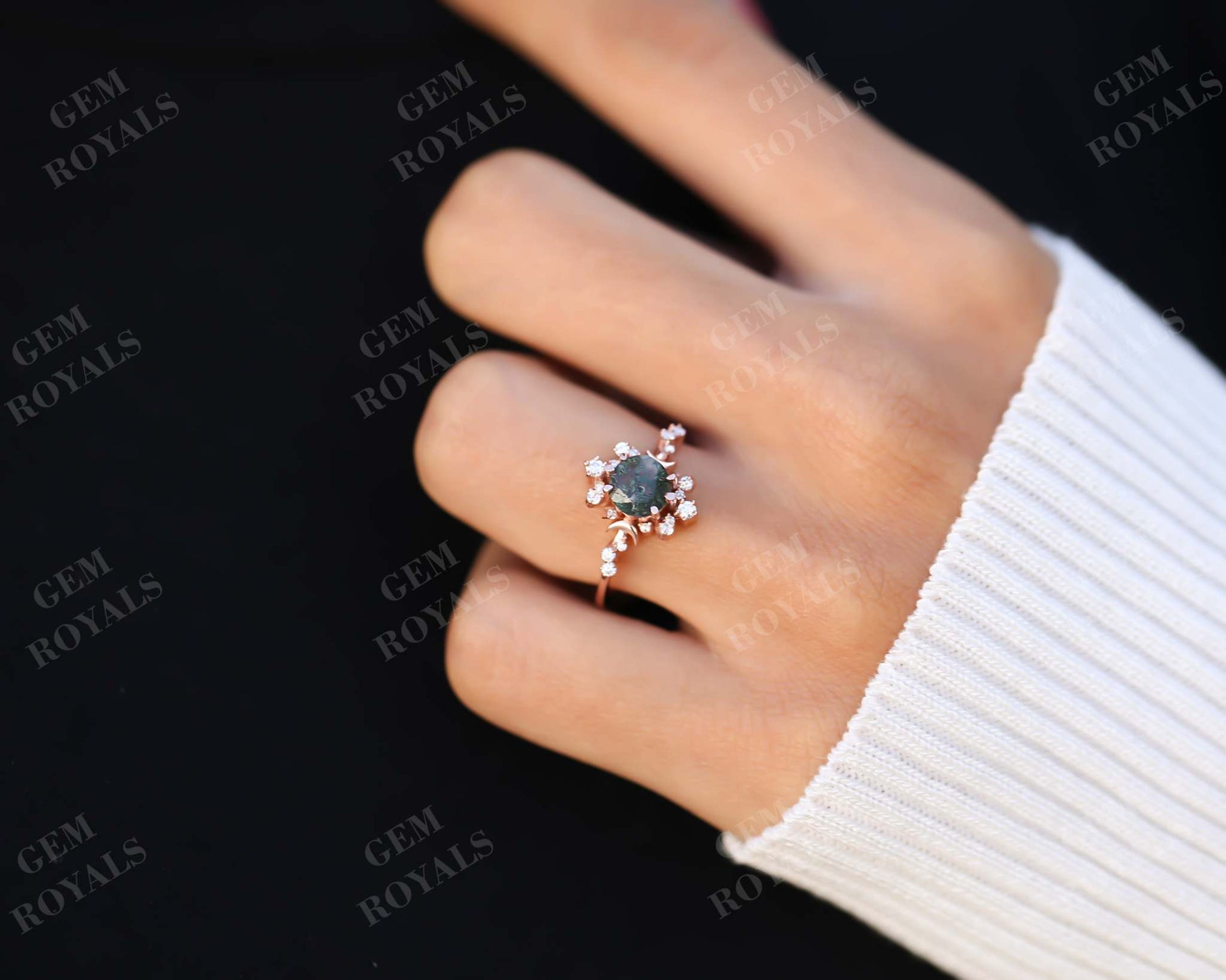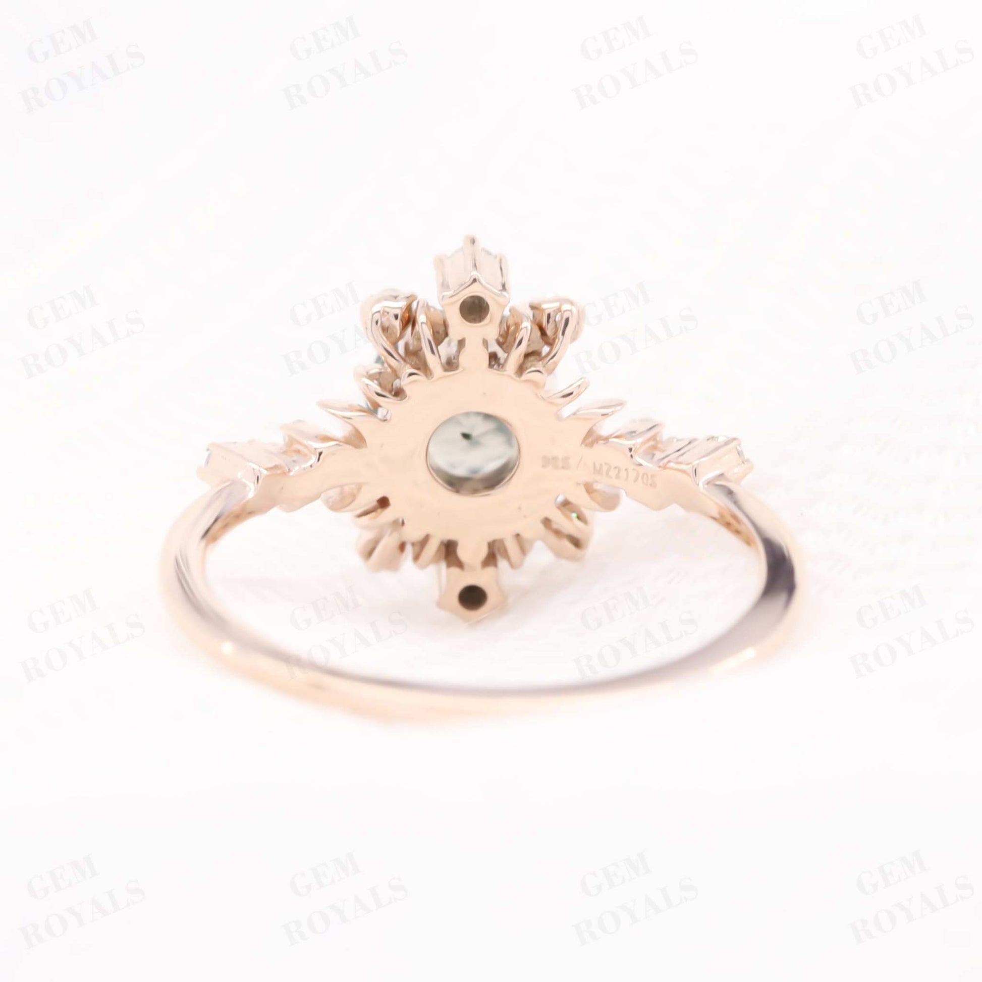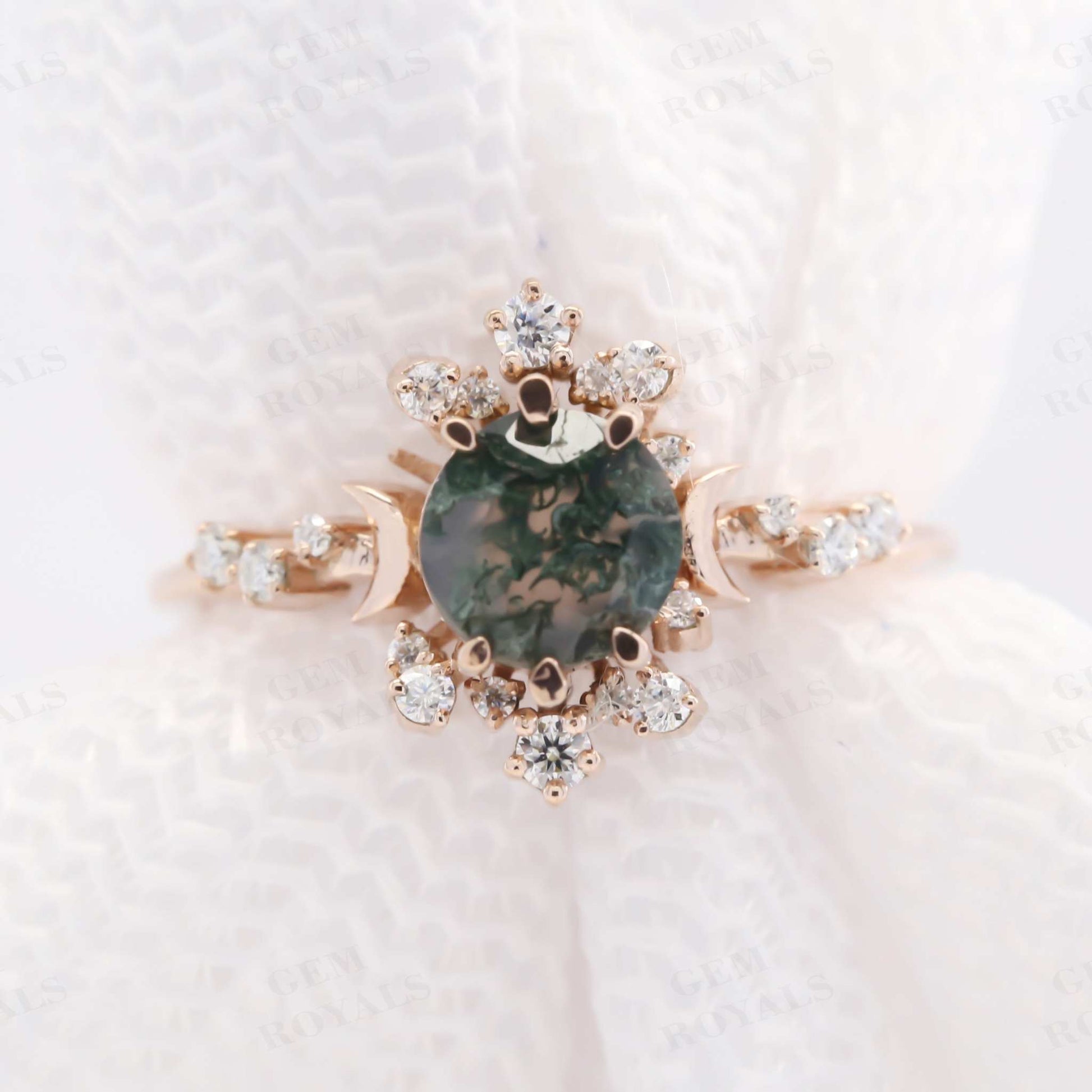 Art Deco Round Natural Green Moss Agate Engagement Ring