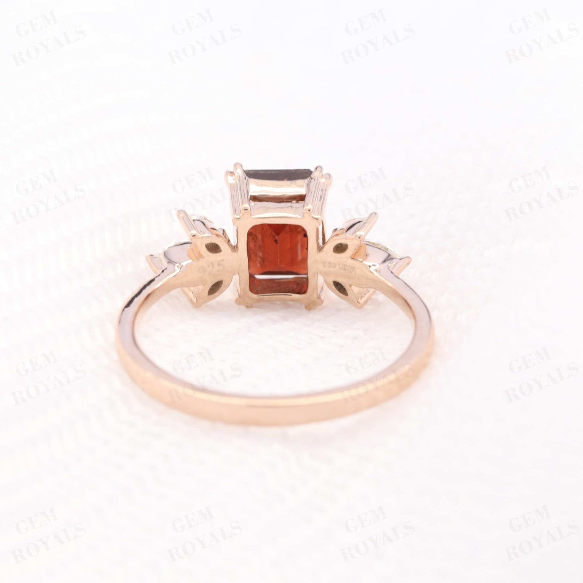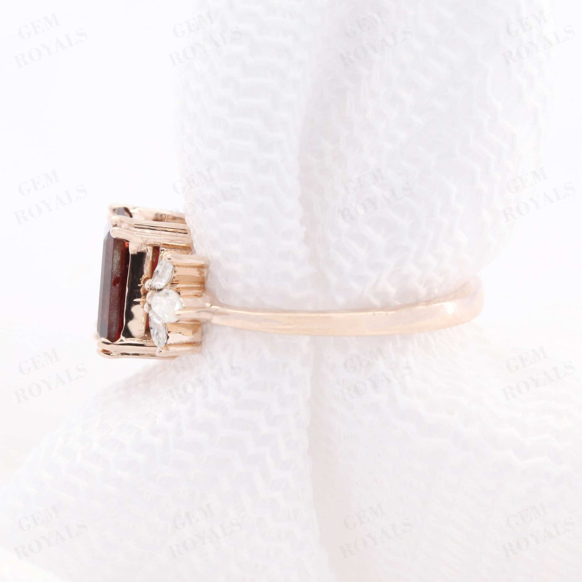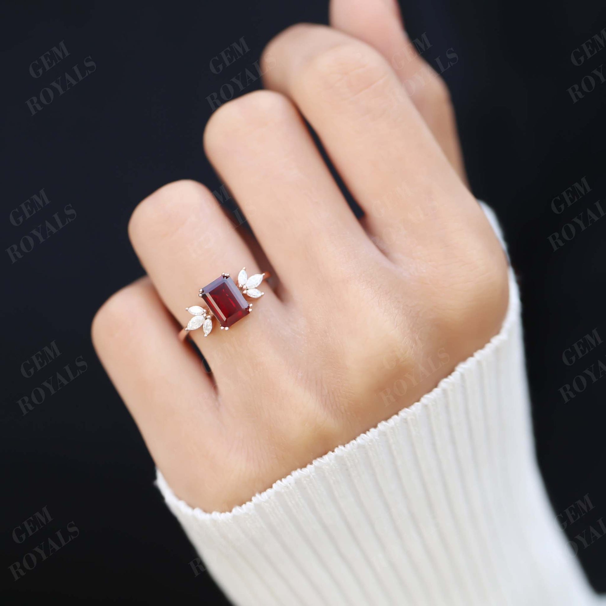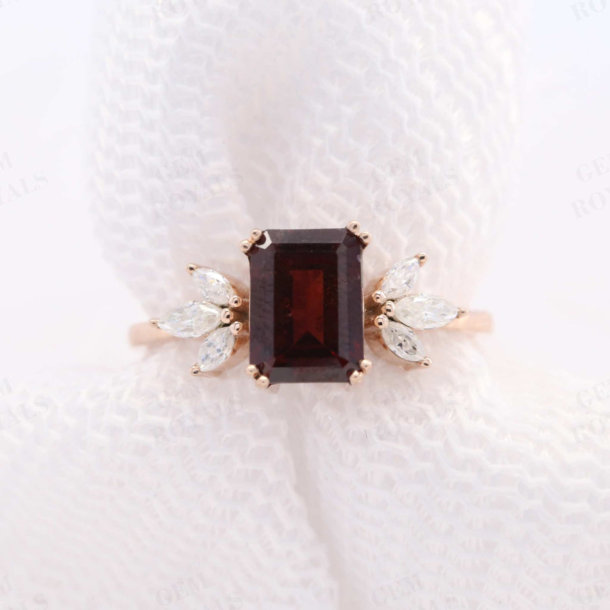 Cluster Emerald Cut Red Garnet Engagement Ring