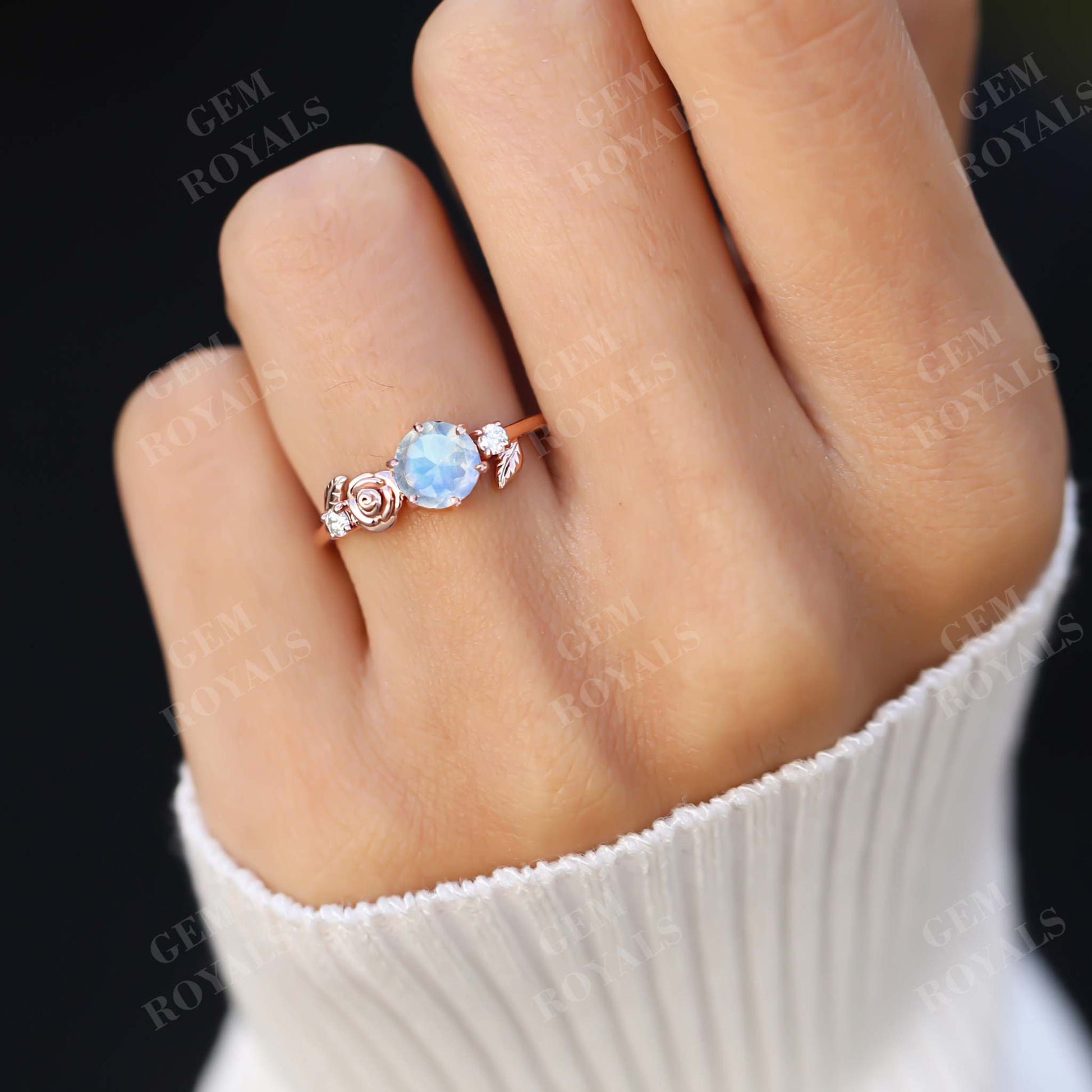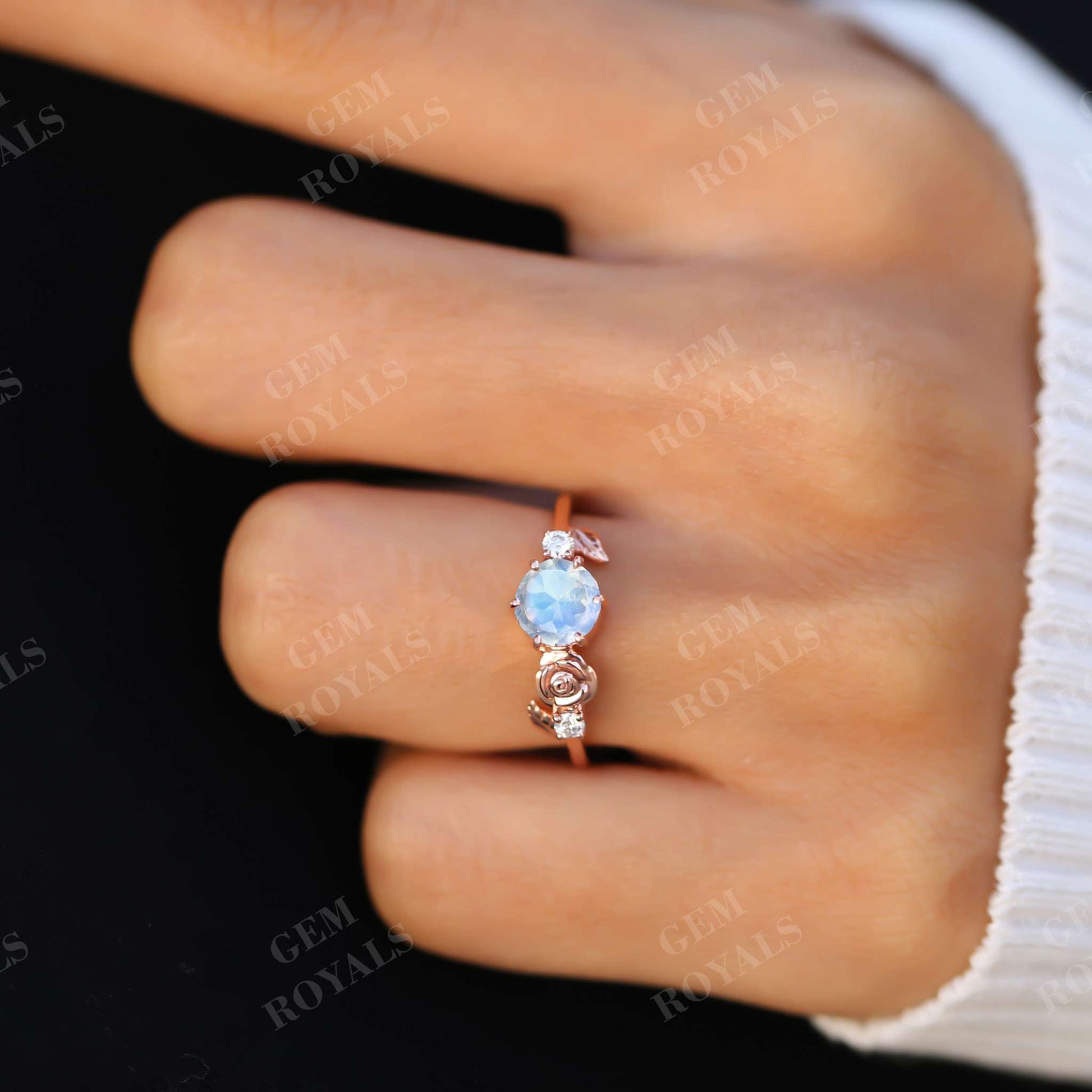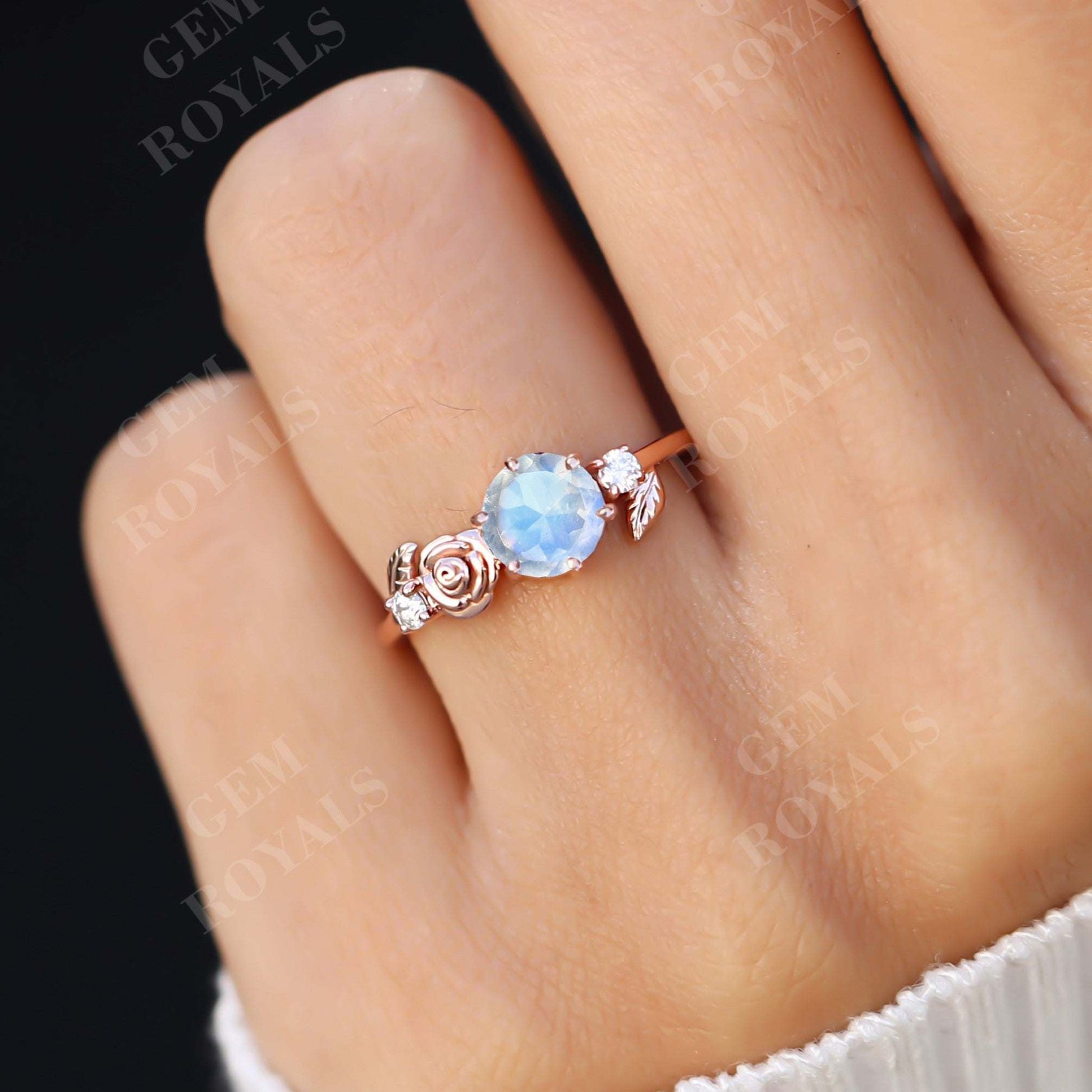 Dainty Flower Round Cut Moonstone Engagement Ring