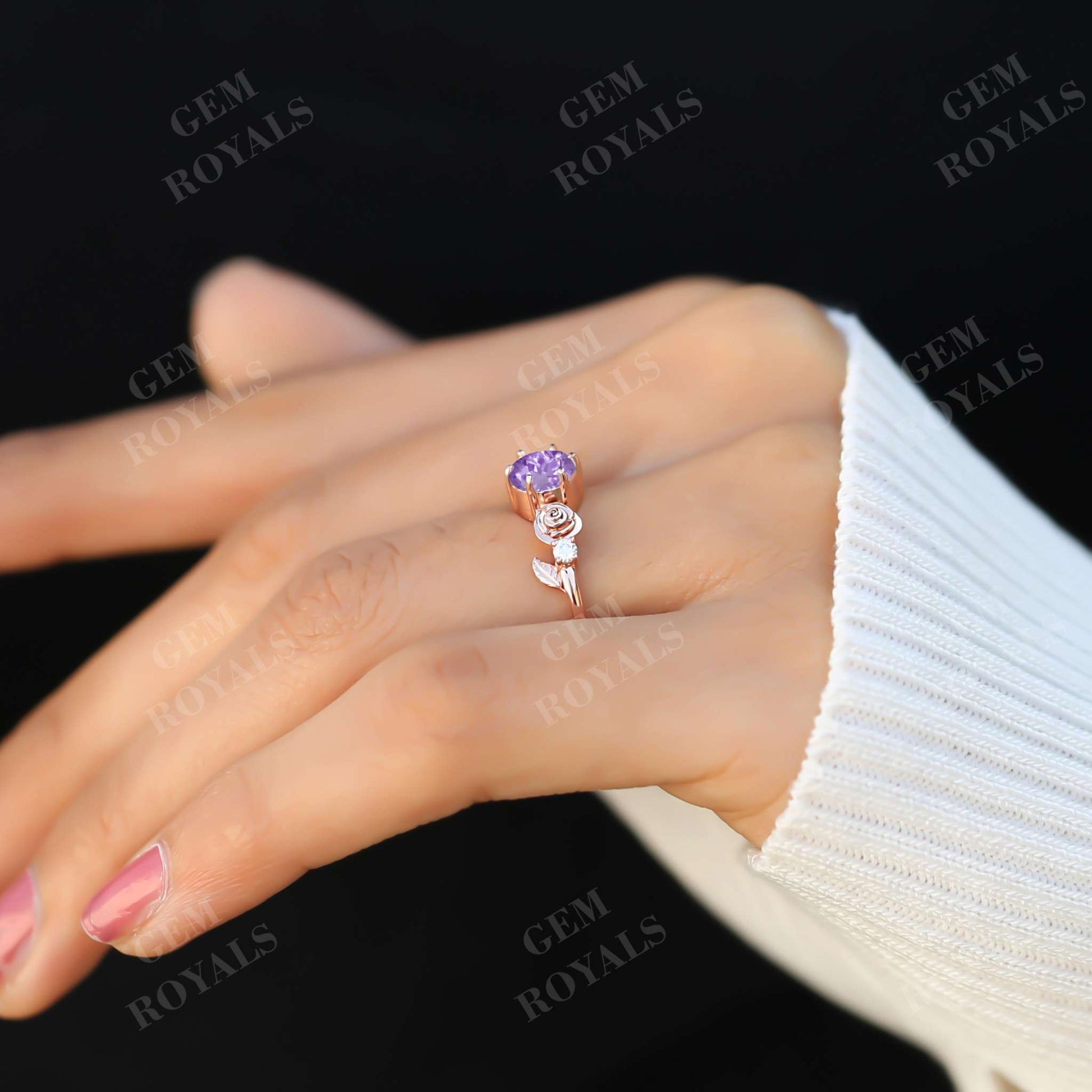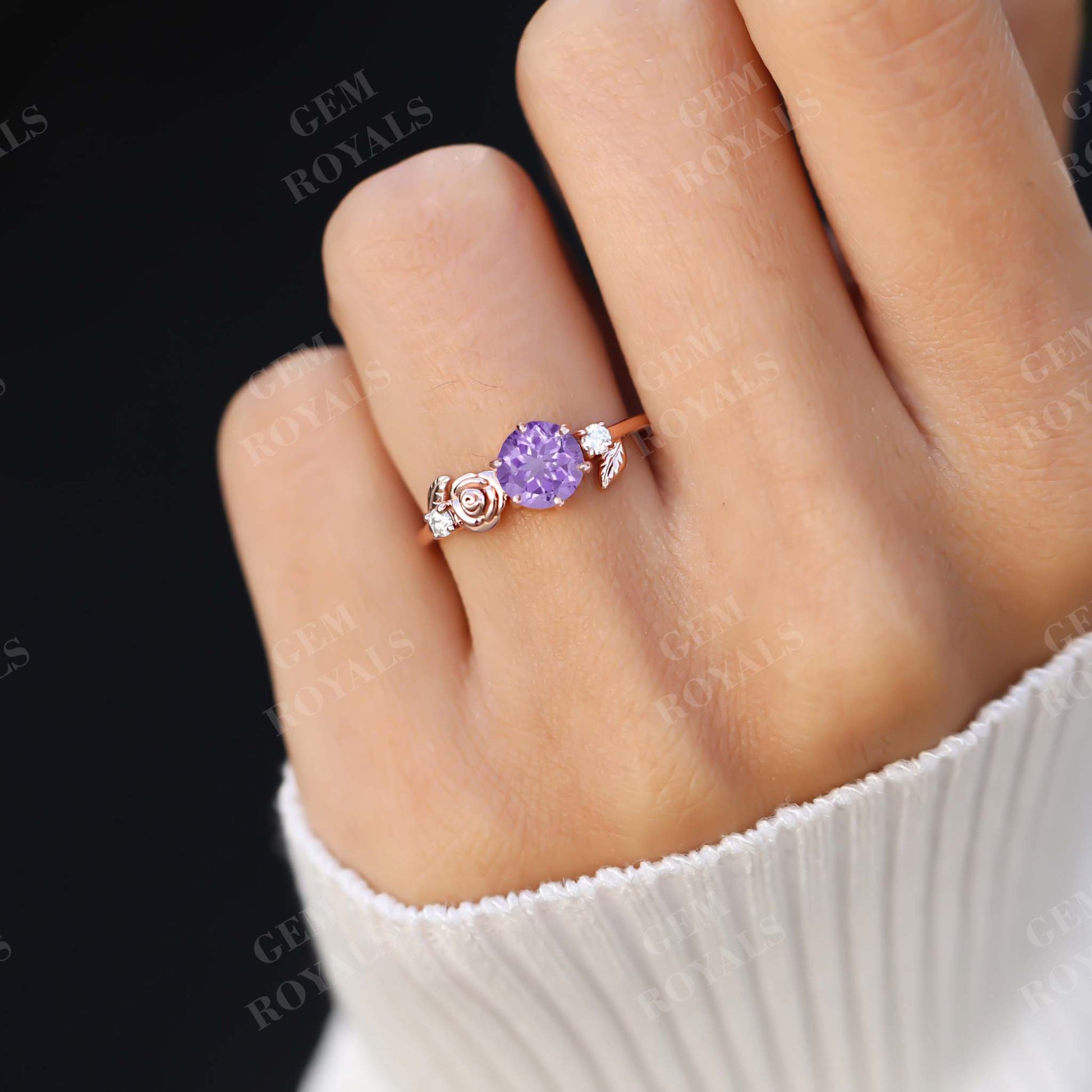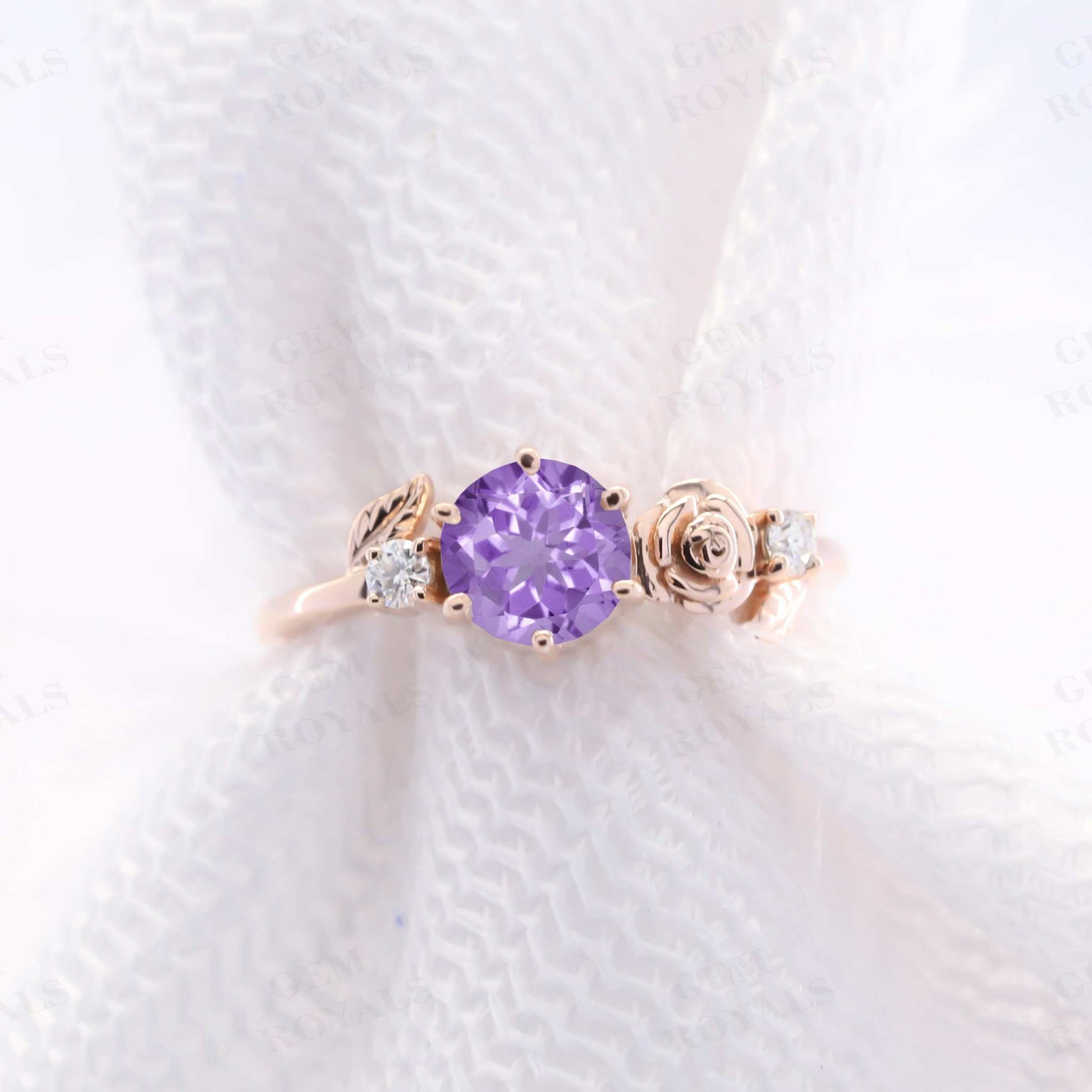 Dainty Flower Round Natural Amethyst Engagement Ring