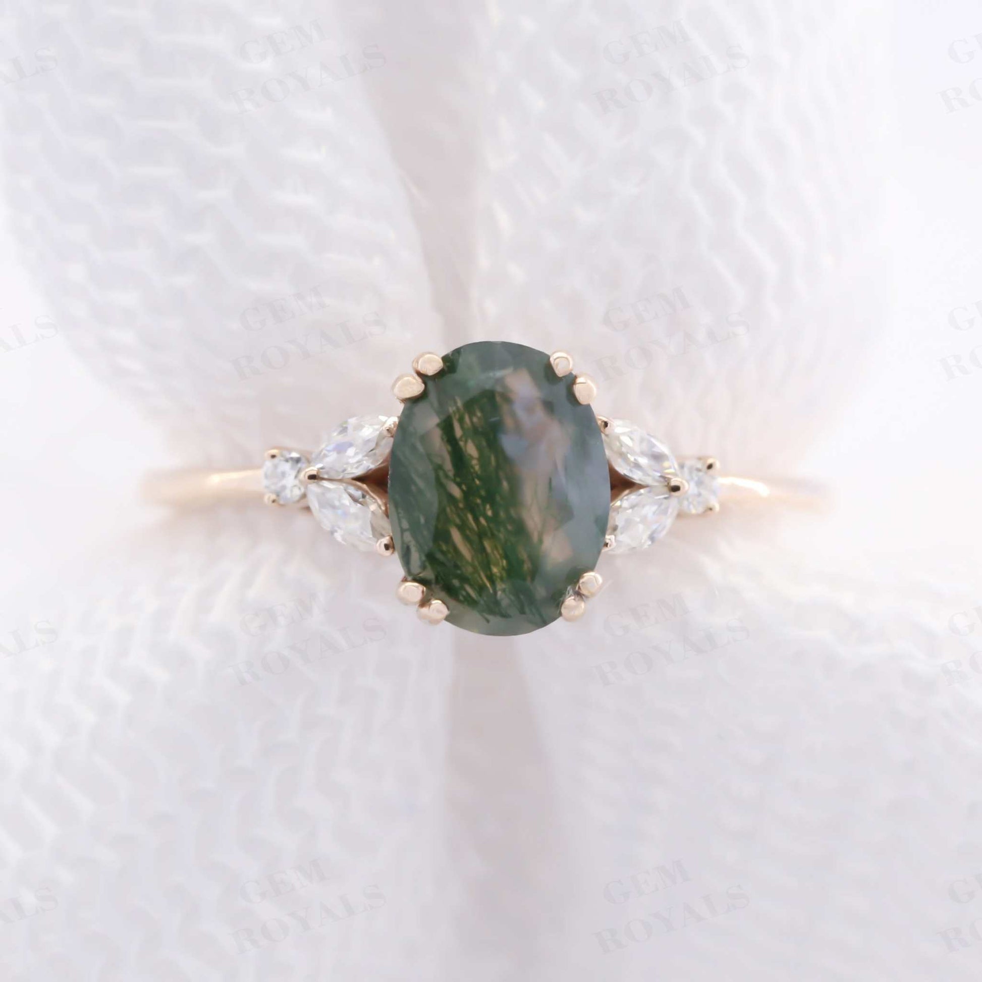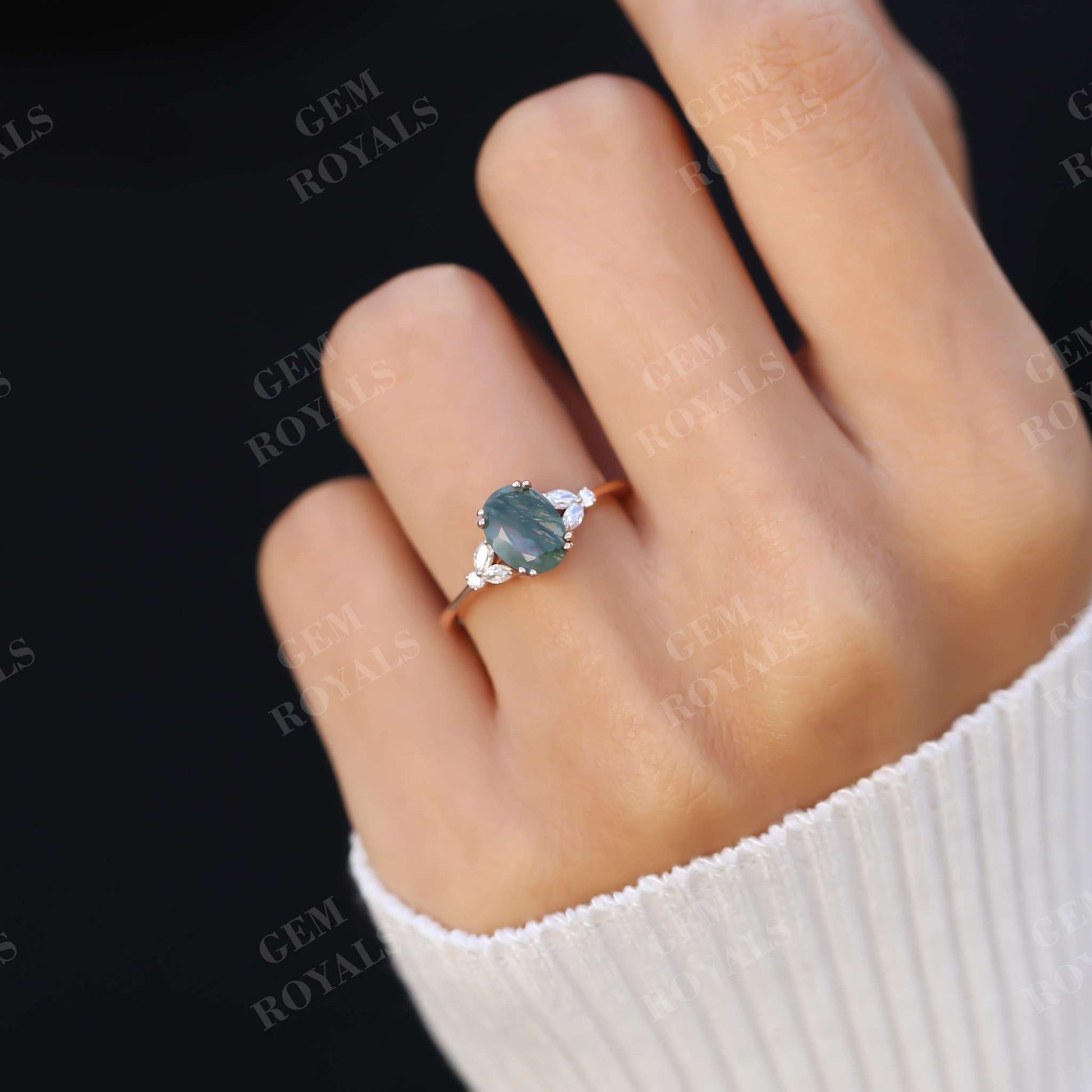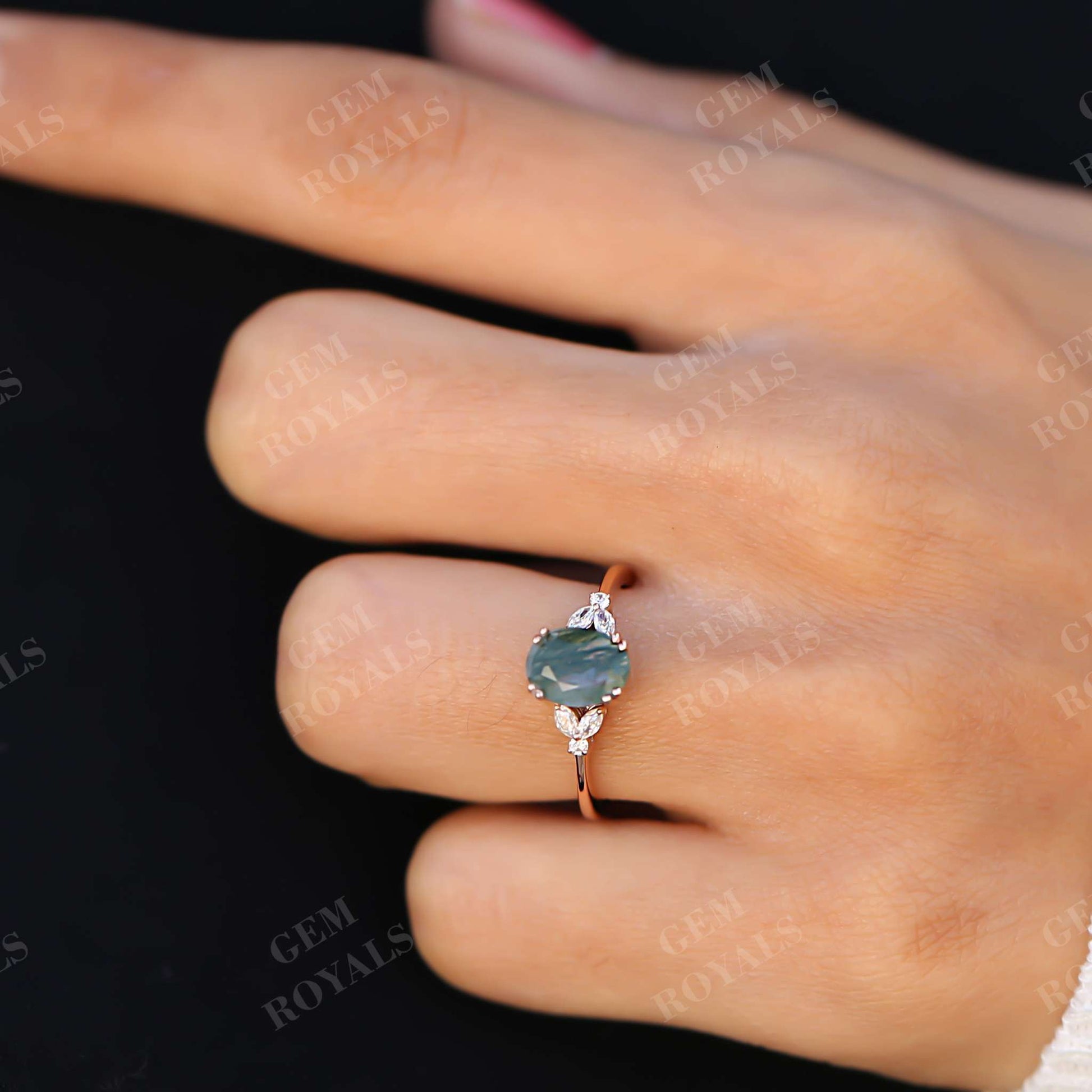 Unique Cluster Oval Green Moss Agate Engagement Ring