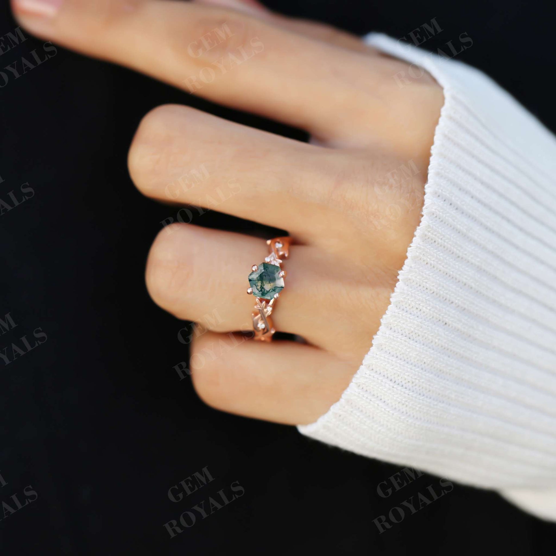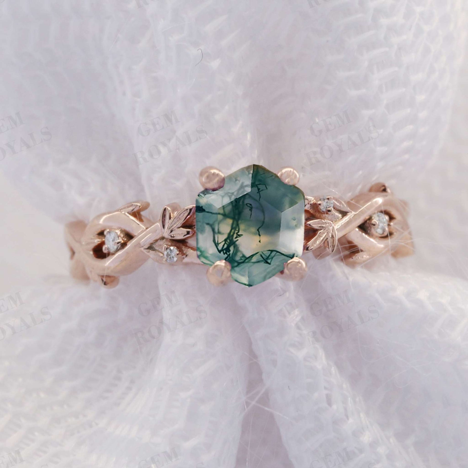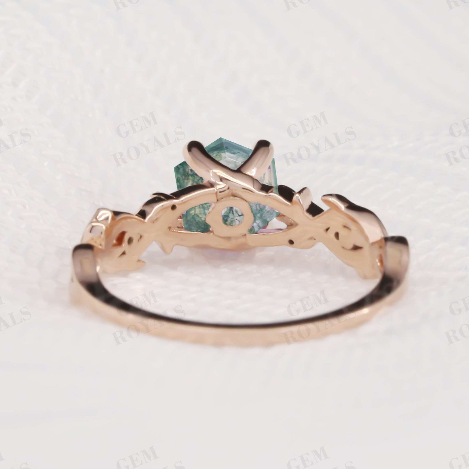 Unique Hexagon Cut Natural Moss Agate Engagement Ring