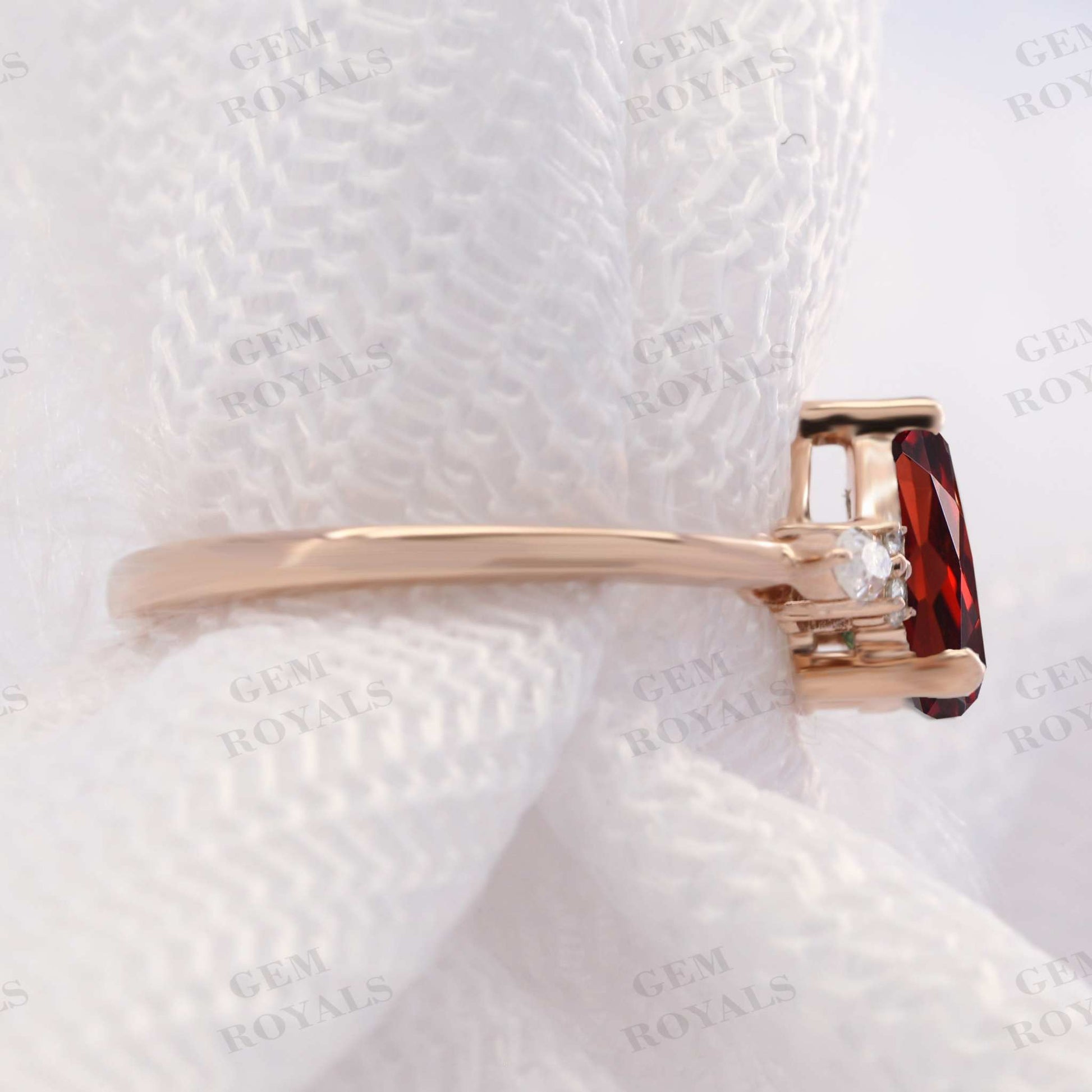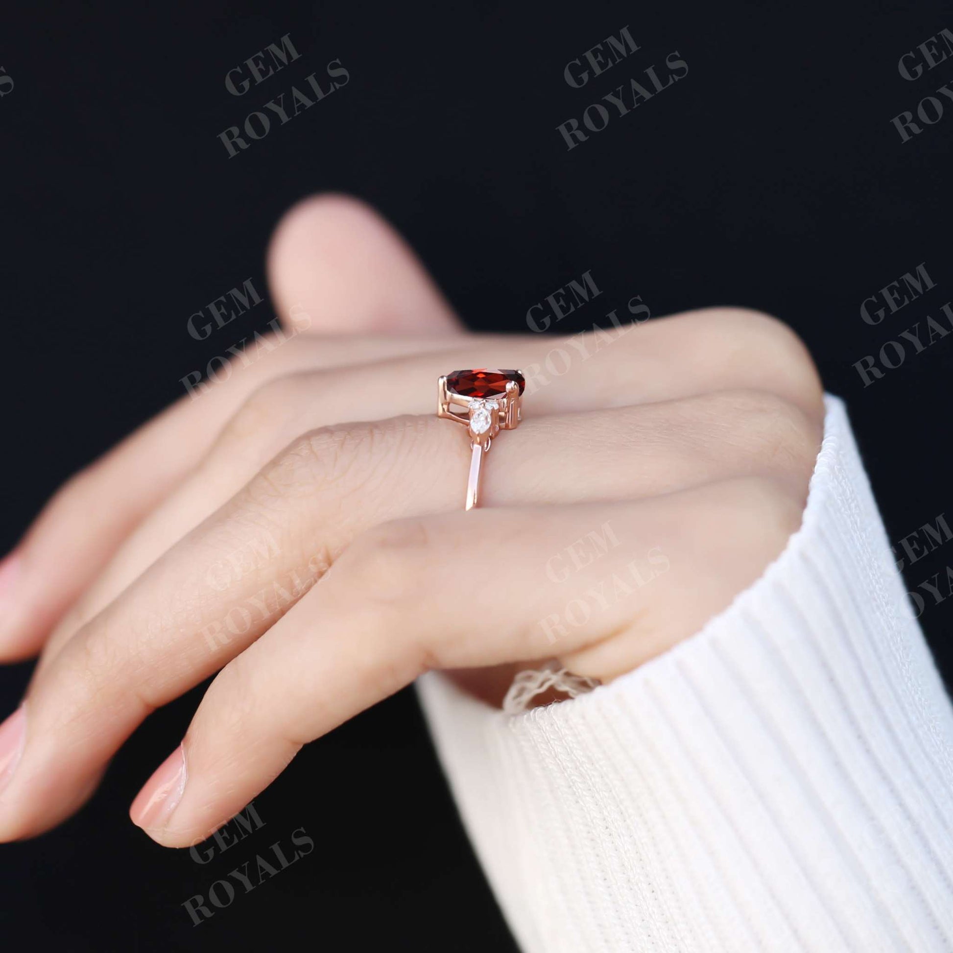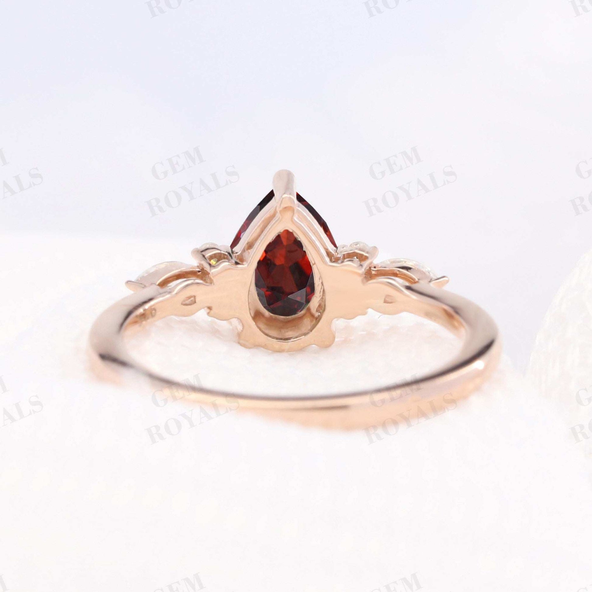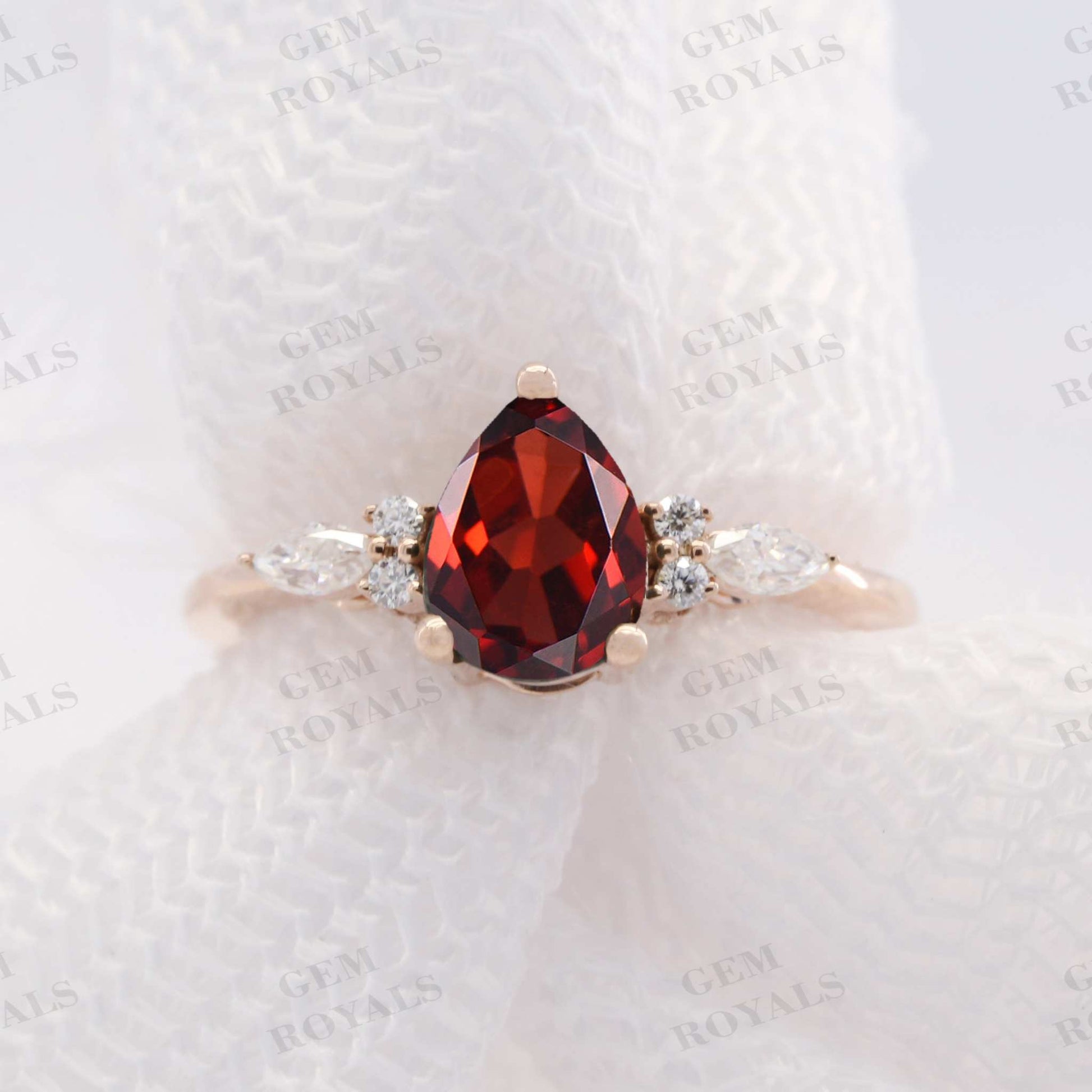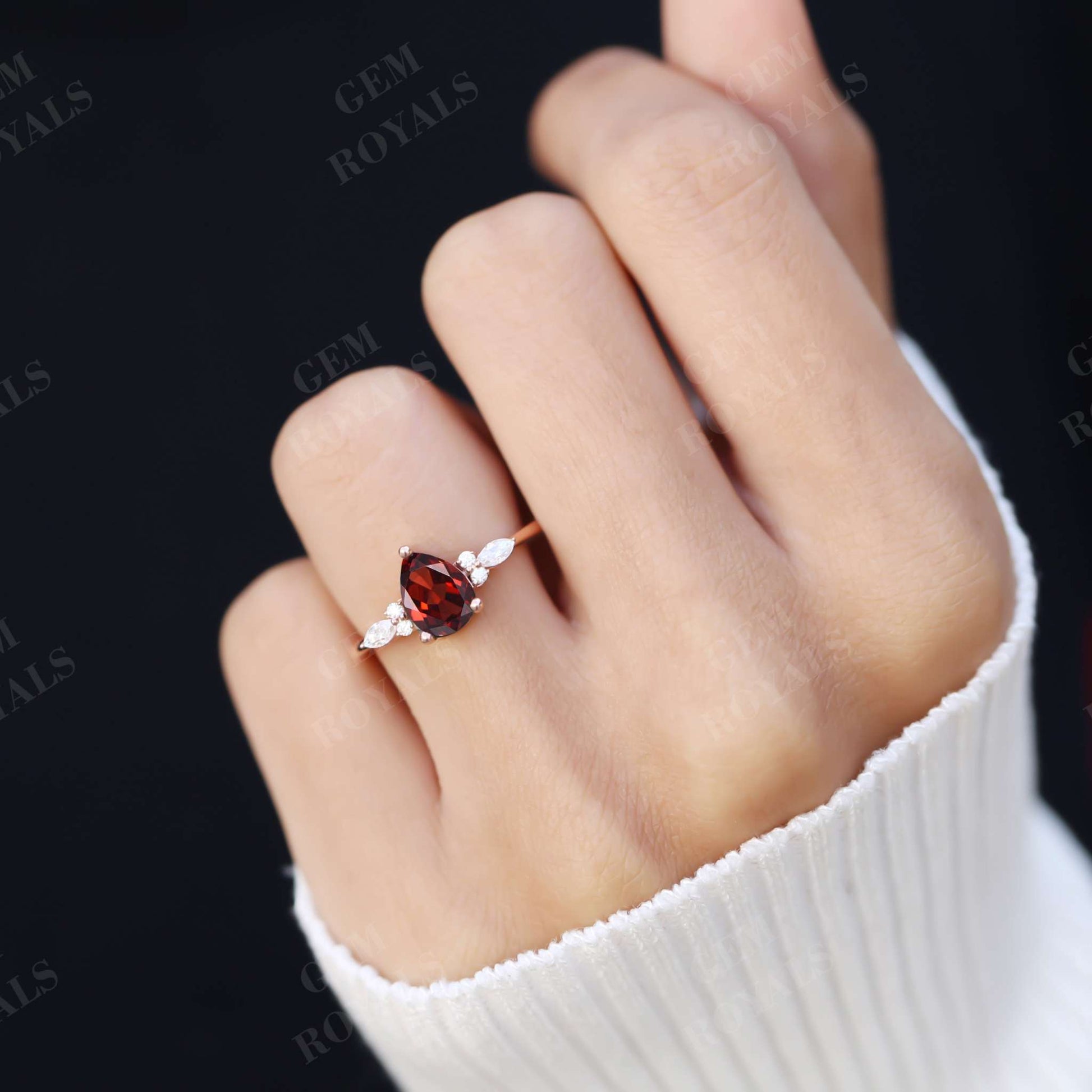 Celebrate love with this exquisite vintage-inspired engagement ring featuring a stunning pear-shaped garnet set in rose gold. Adorned with a cluster of marquise and round moissanite stones, it exudes timeless elegance. Available in 10K, 14K, or 18K rose, yellow, or white gold, it's the perfect anniversary or wedding ring for her.