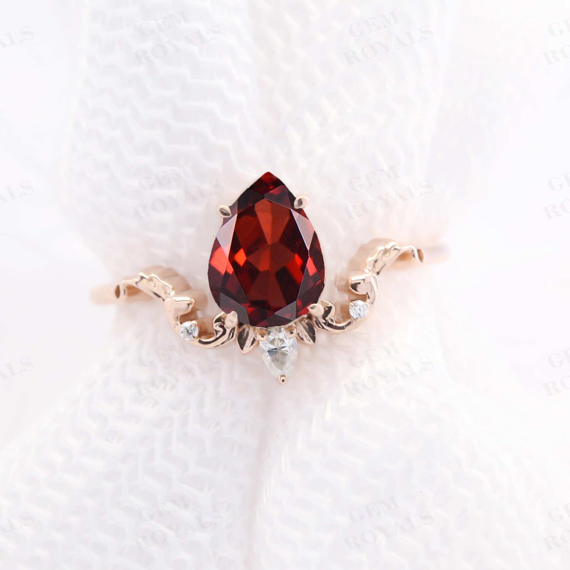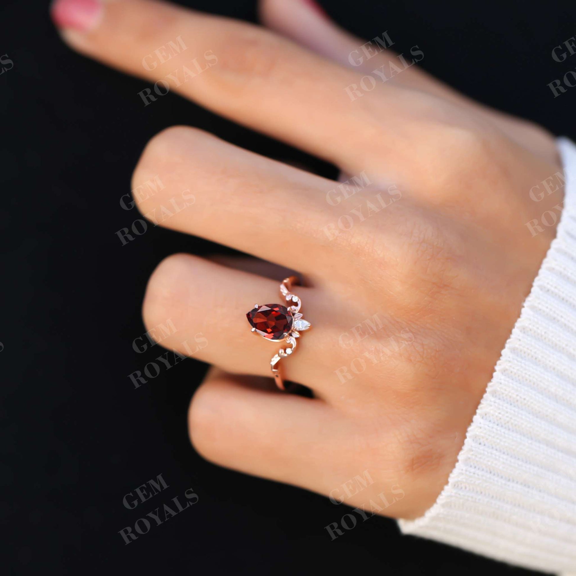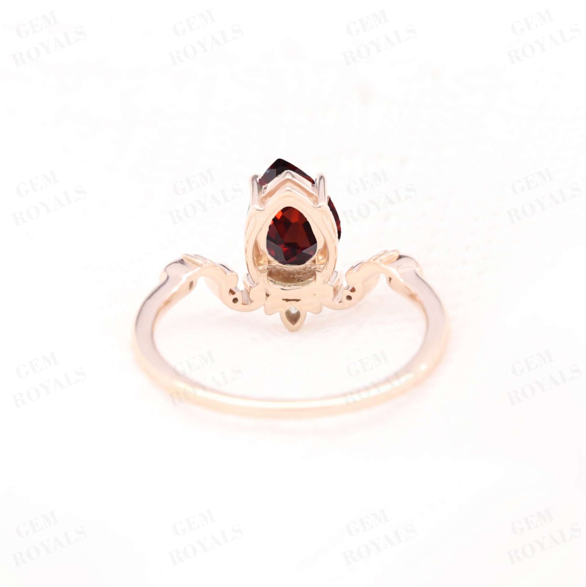 Discover timeless elegance with our vintage-inspired pear-shaped red garnet engagement ring, adorned with antique diamonds in rose gold. This exquisite piece exudes sophistication and charm, perfect for symbolizing everlasting love. Crafted in your choice of 10K, 14K, or 18K white, yellow, or rose gold, it's a stunning gemstone wedding ring or promise ring, making it an unforgettable gift for her.