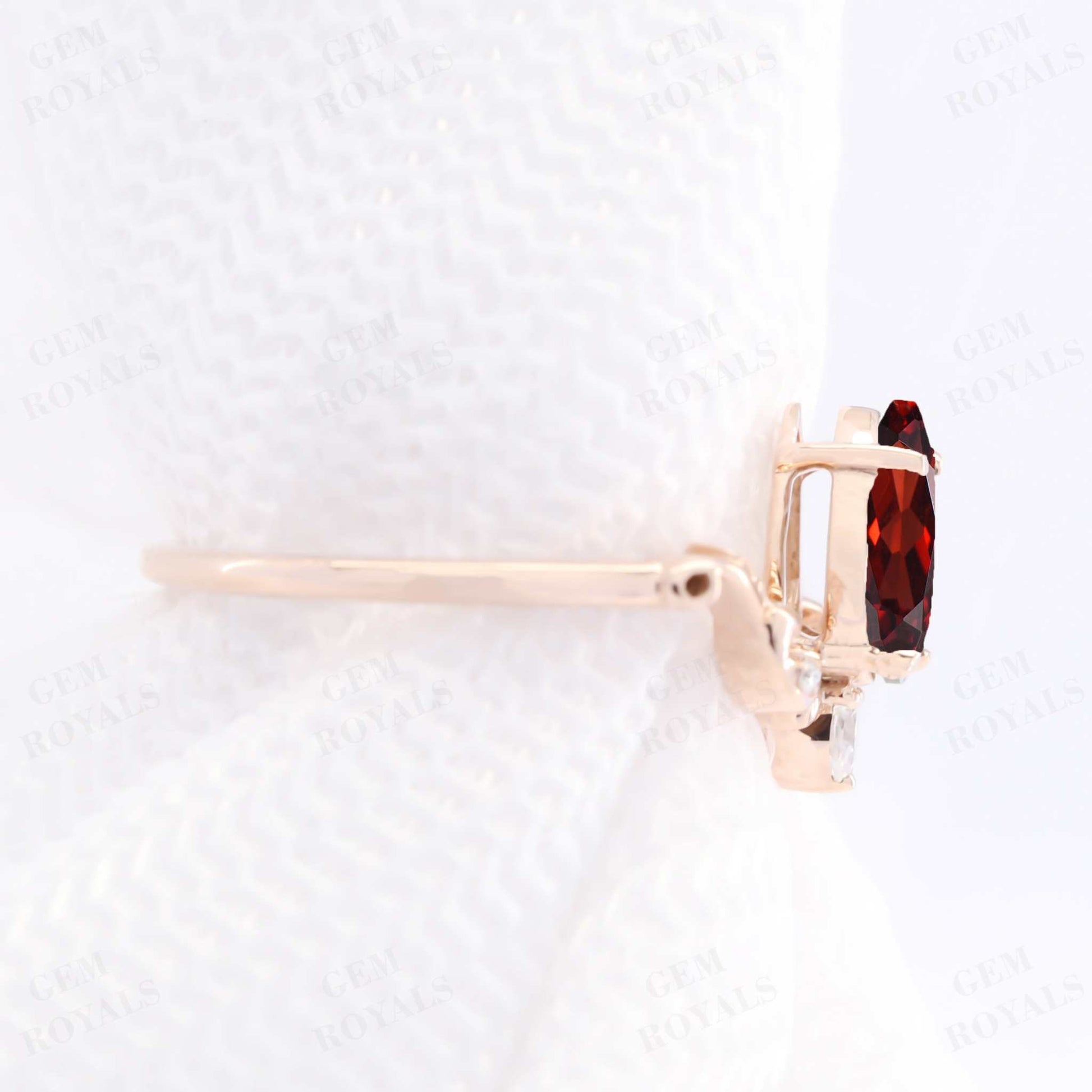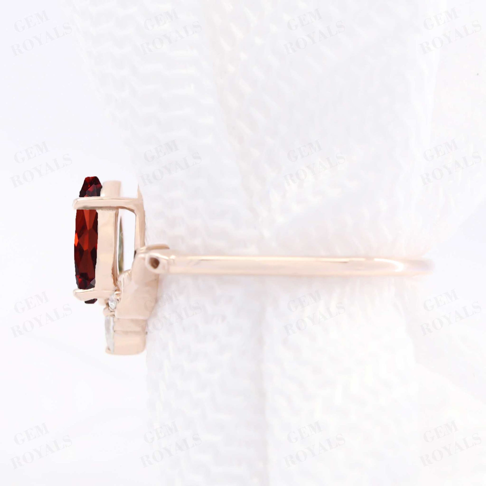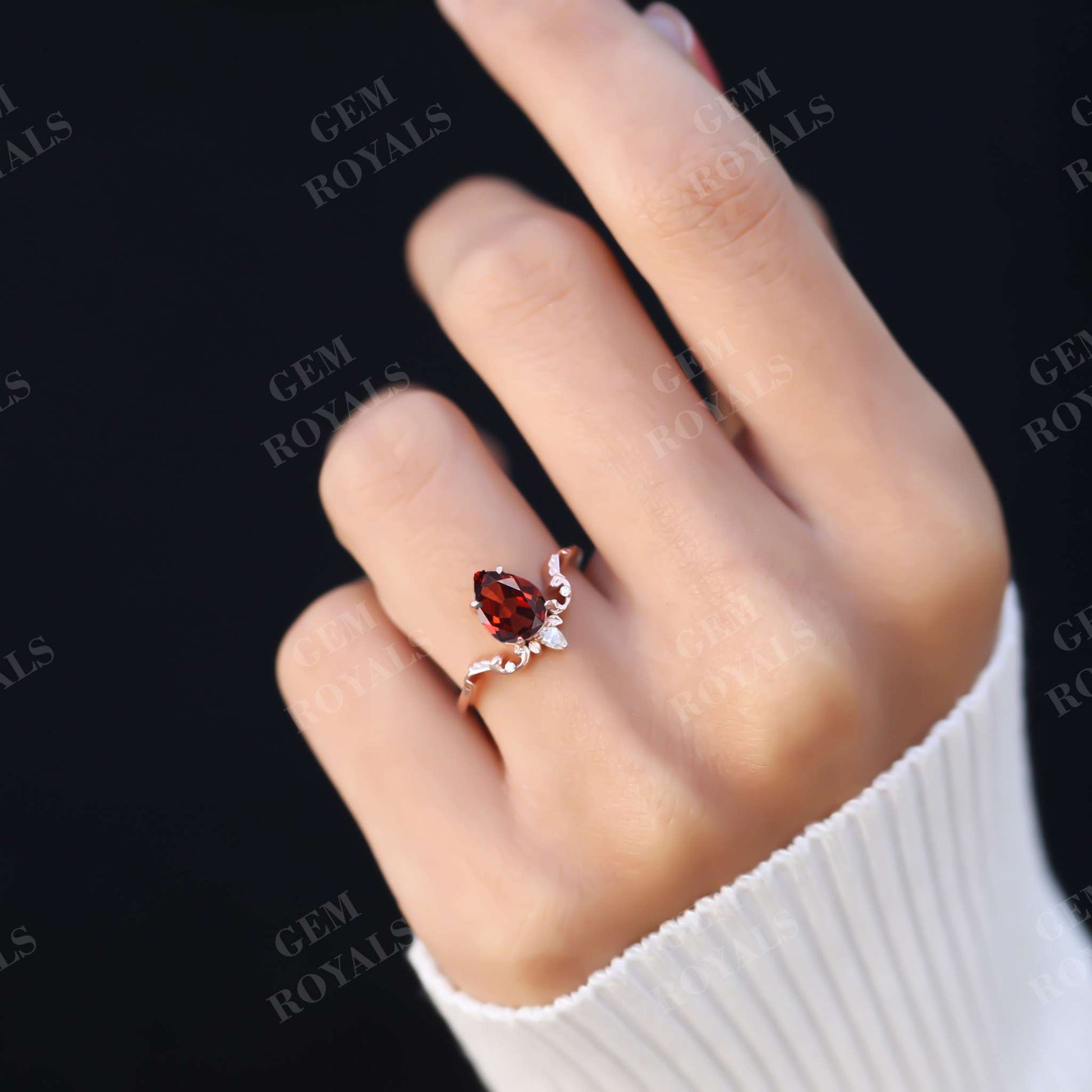 Discover timeless elegance with our vintage-inspired pear-shaped red garnet engagement ring, adorned with antique diamonds in rose gold. This exquisite piece exudes sophistication and charm, perfect for symbolizing everlasting love. Crafted in your choice of 10K, 14K, or 18K white, yellow, or rose gold, it's a stunning gemstone wedding ring or promise ring, making it an unforgettable gift for her.