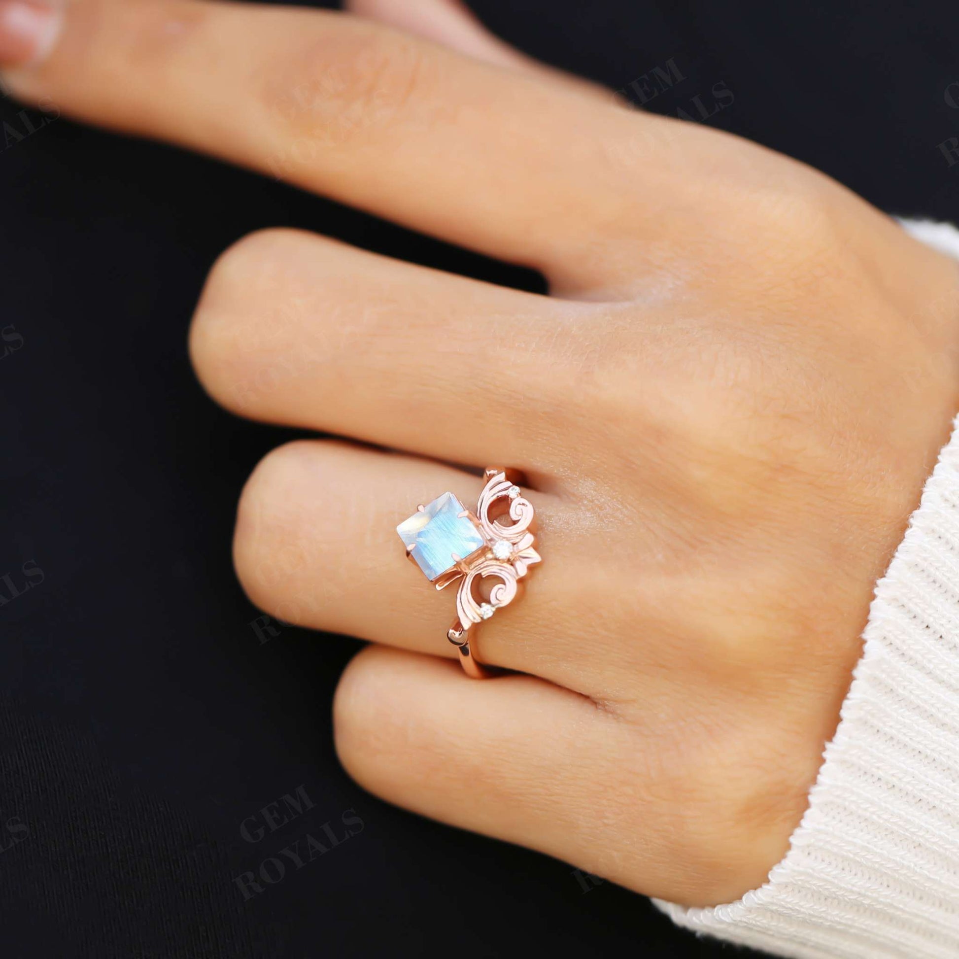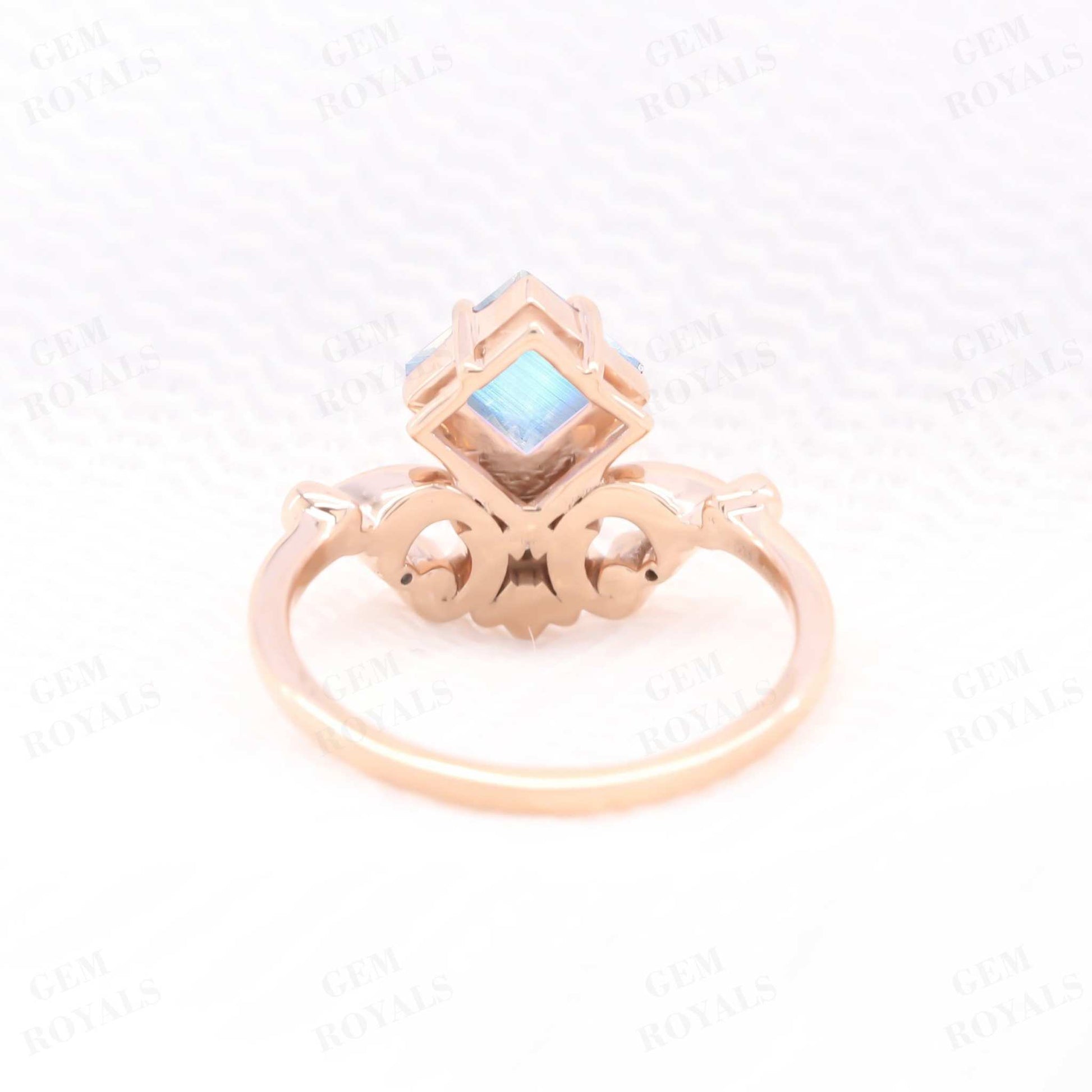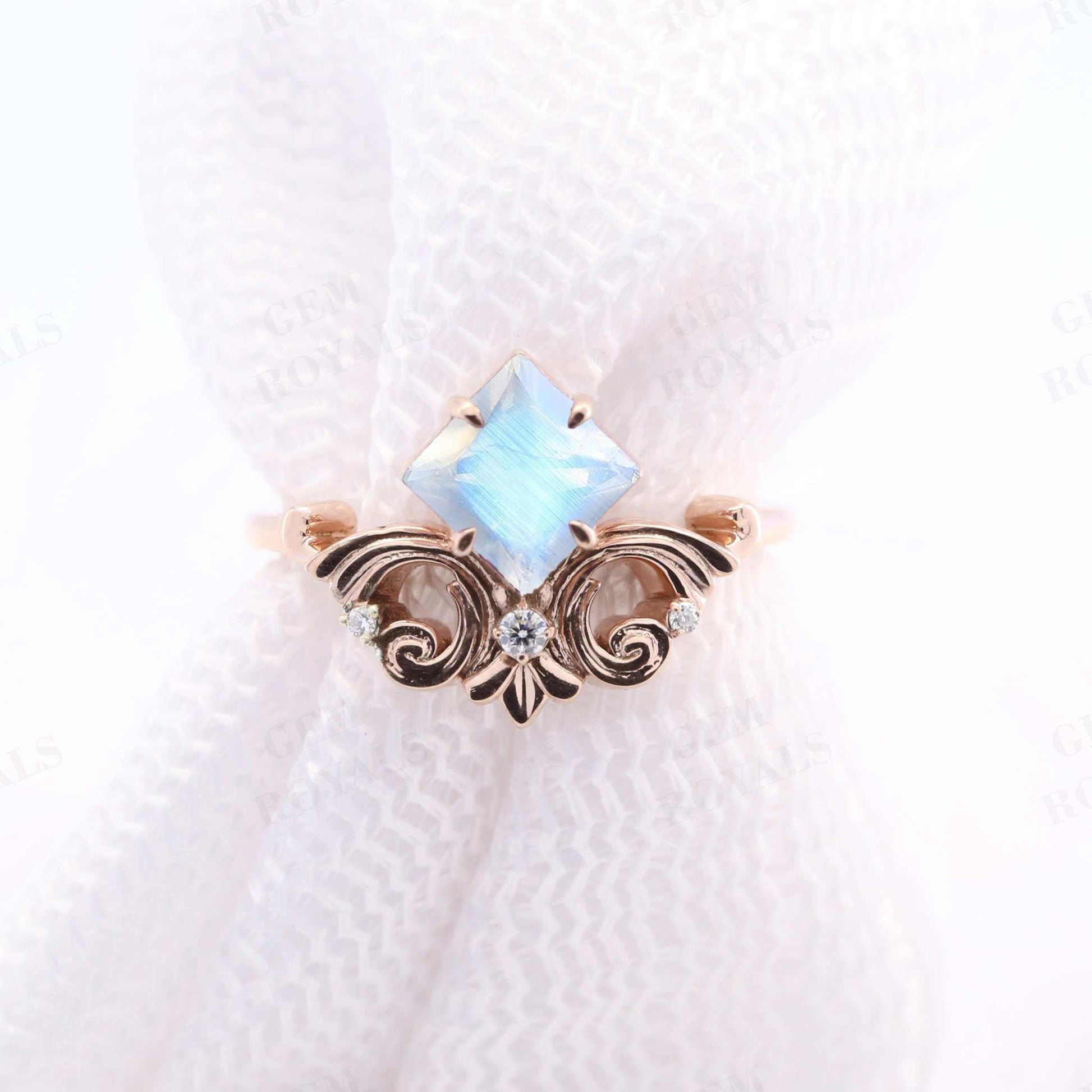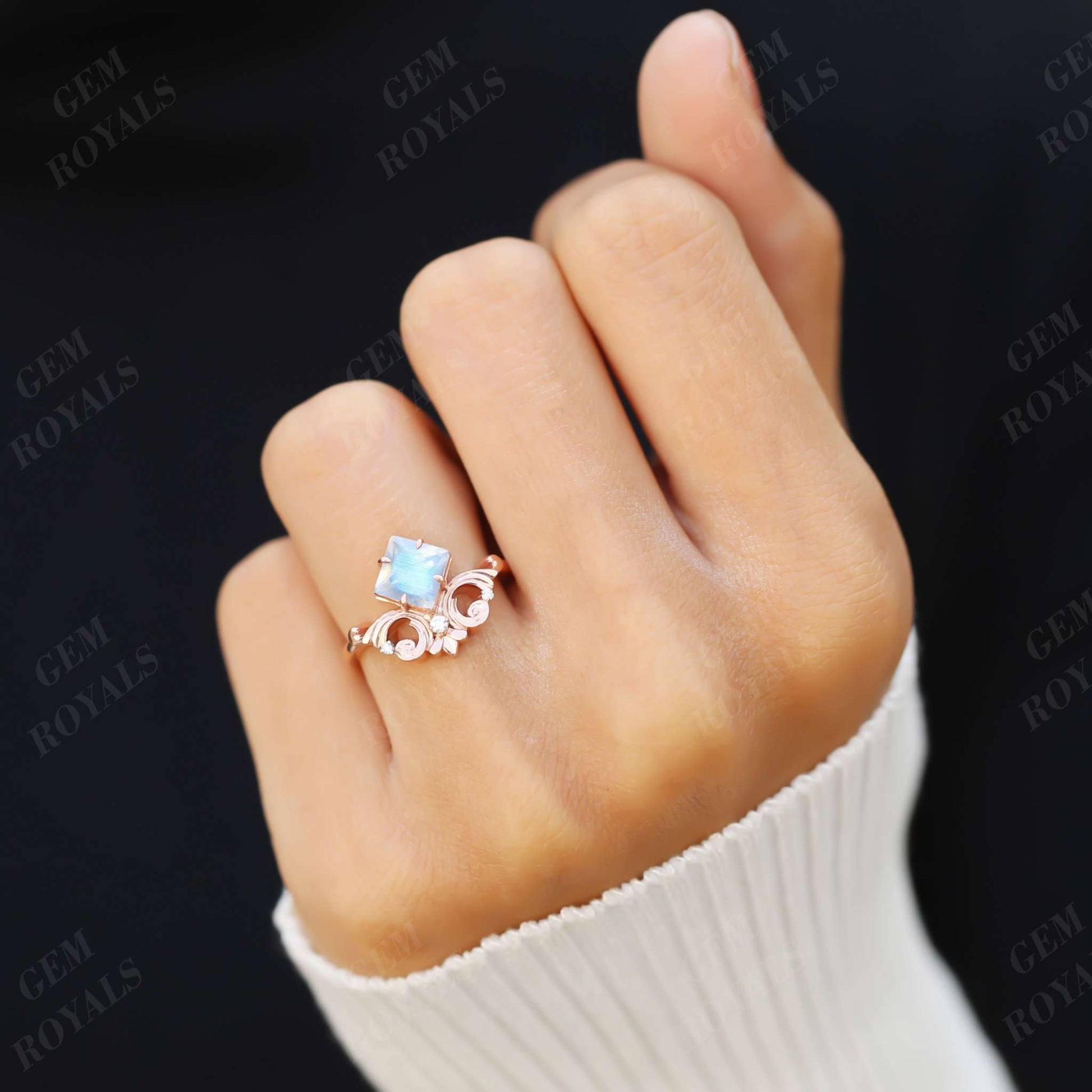 Elevate your love story with this enchanting Princess Cut Moonstone Engagement Ring. Set in 18K Rose Gold with antique diamond accents, it radiates timeless elegance. Customizable in 10K, 14K, or 18K White/Yellow/Rose Gold, it's a perfect symbol of your enduring bond. A mesmerizing choice for a wedding anniversary or a memorable gift for her.