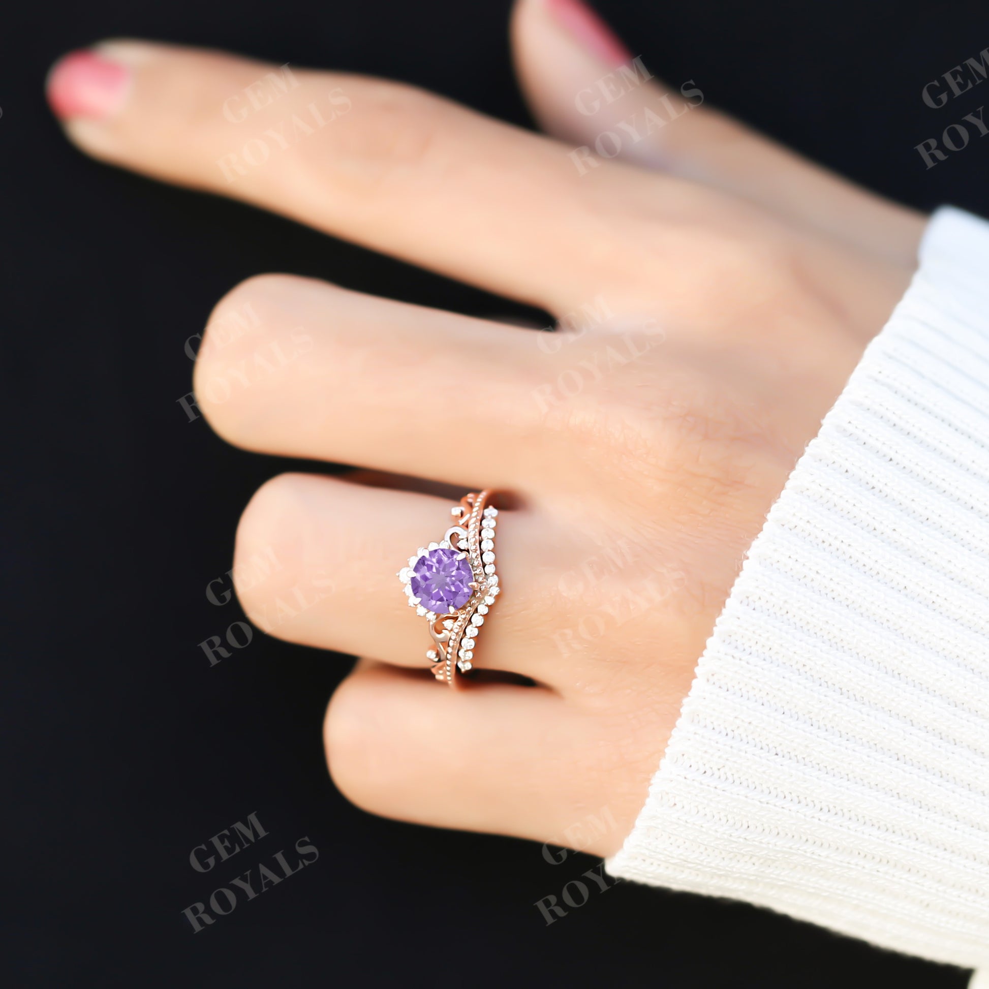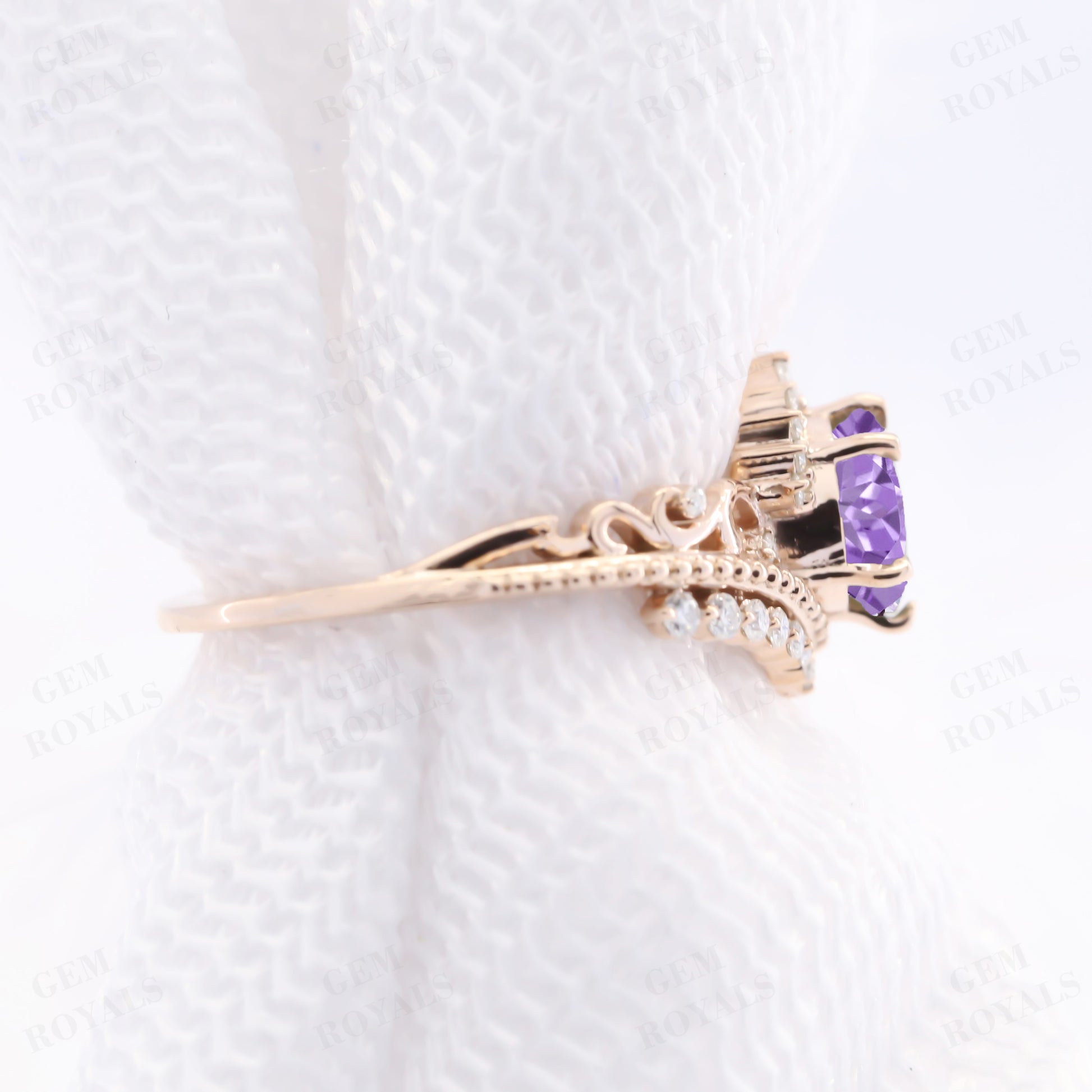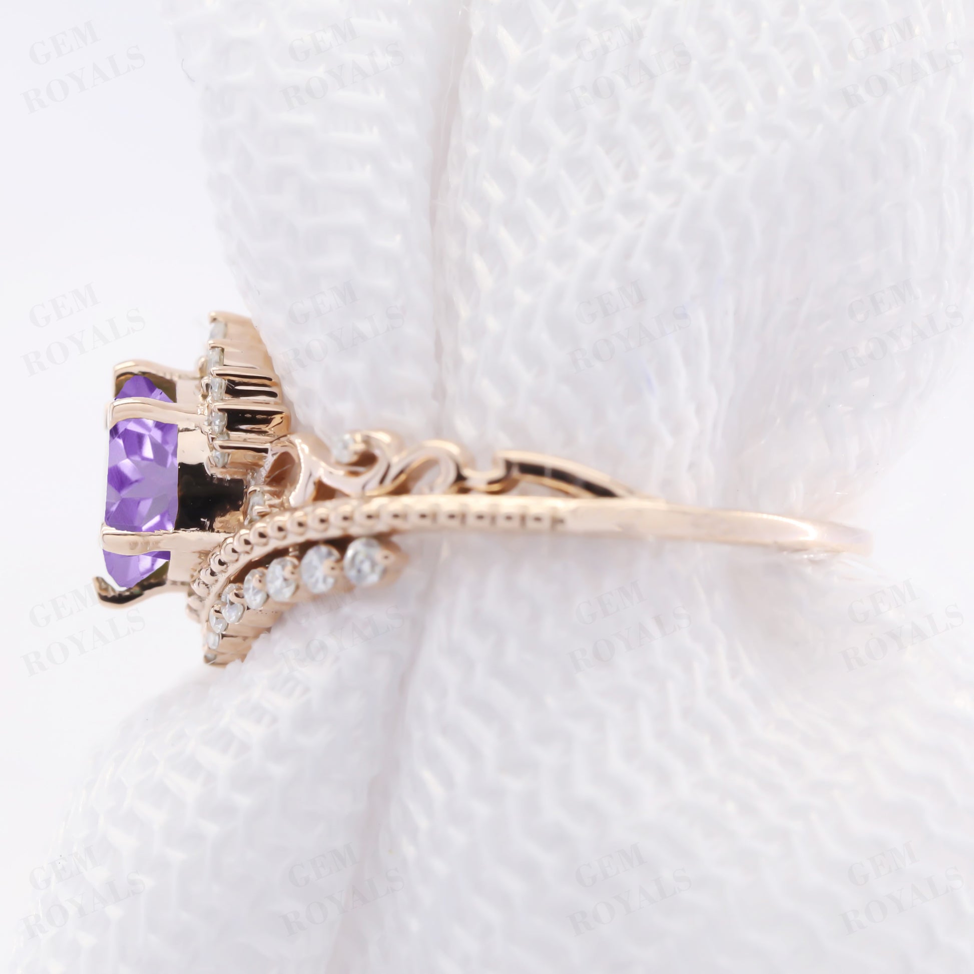 Art Deco Chevron style Round Amethyst Engagement Ring