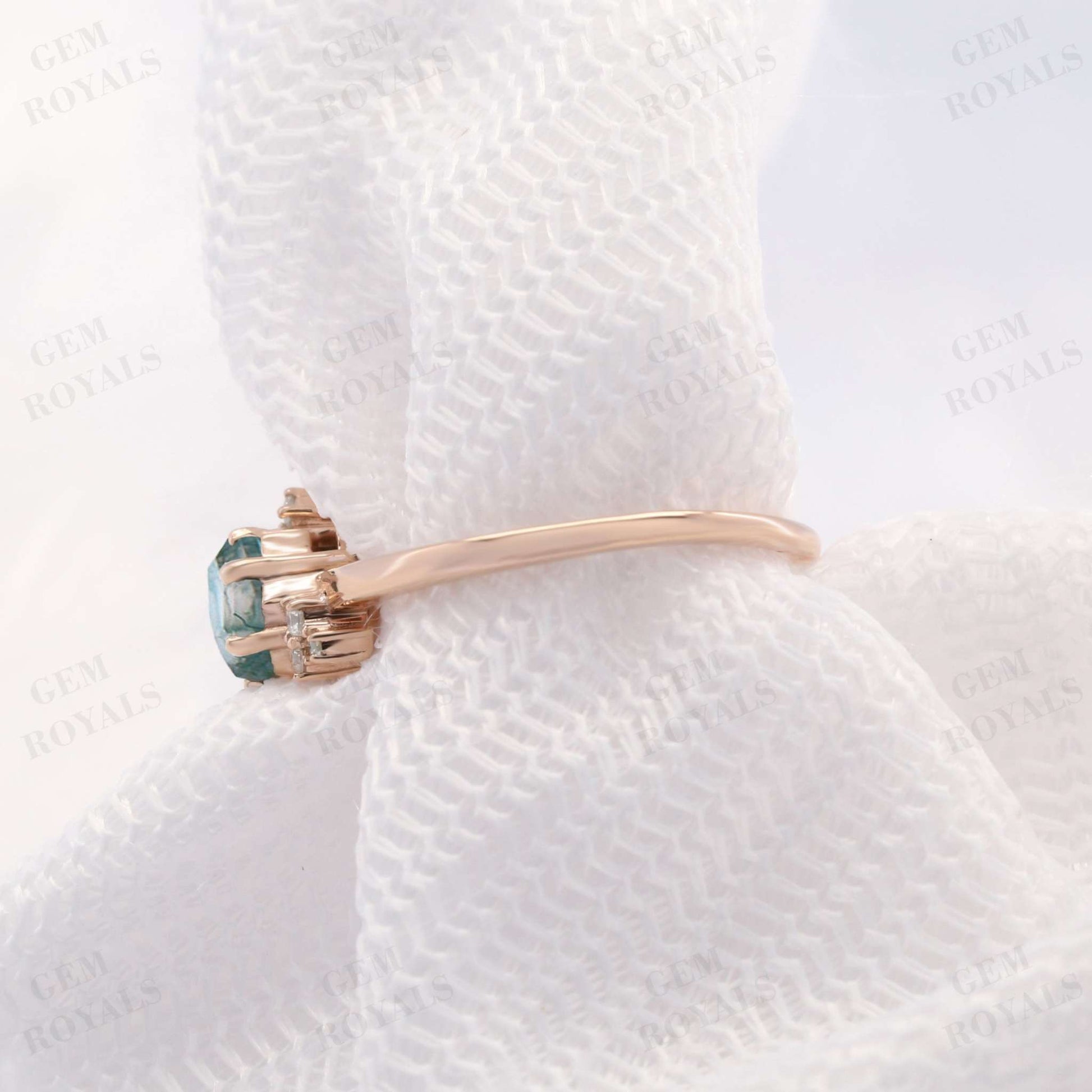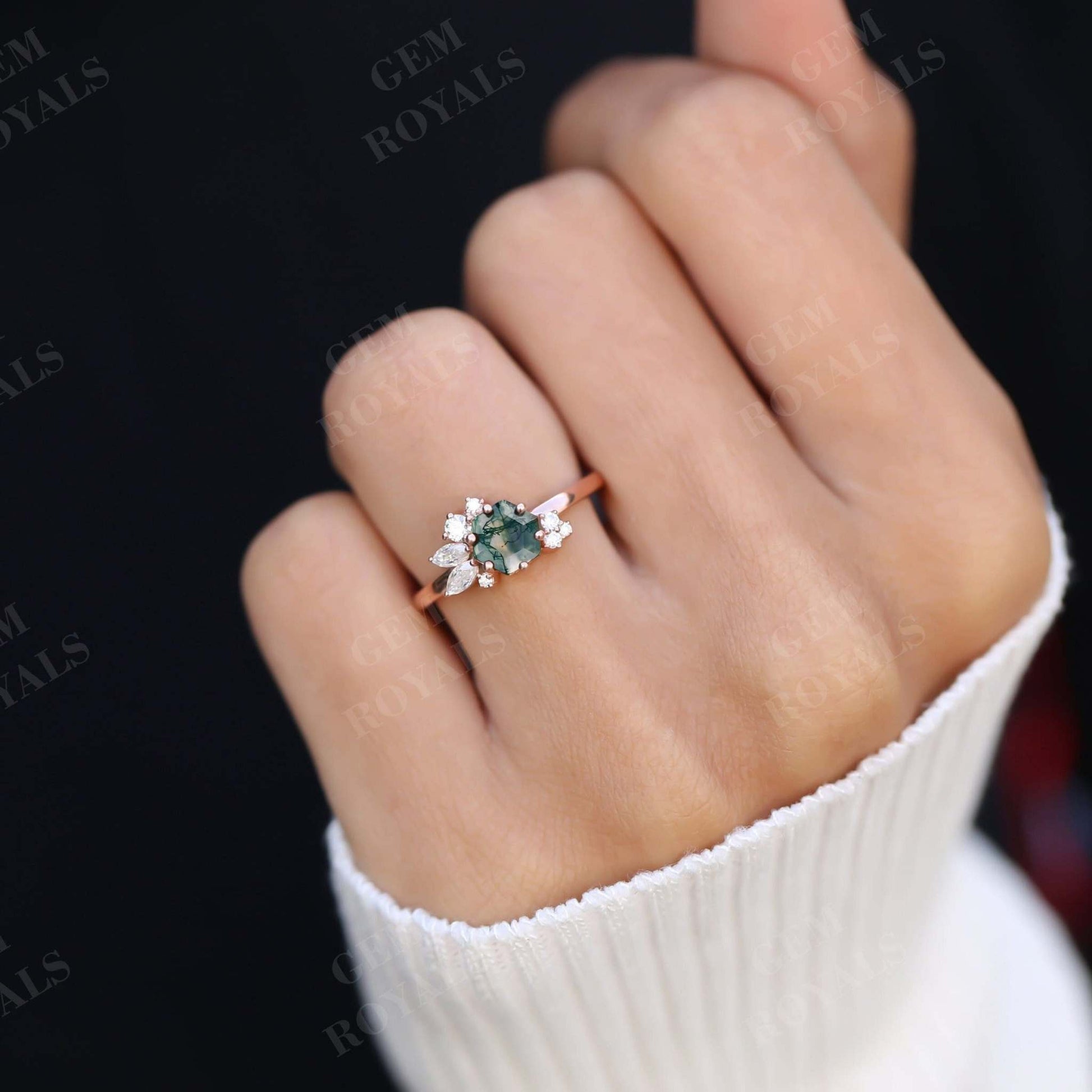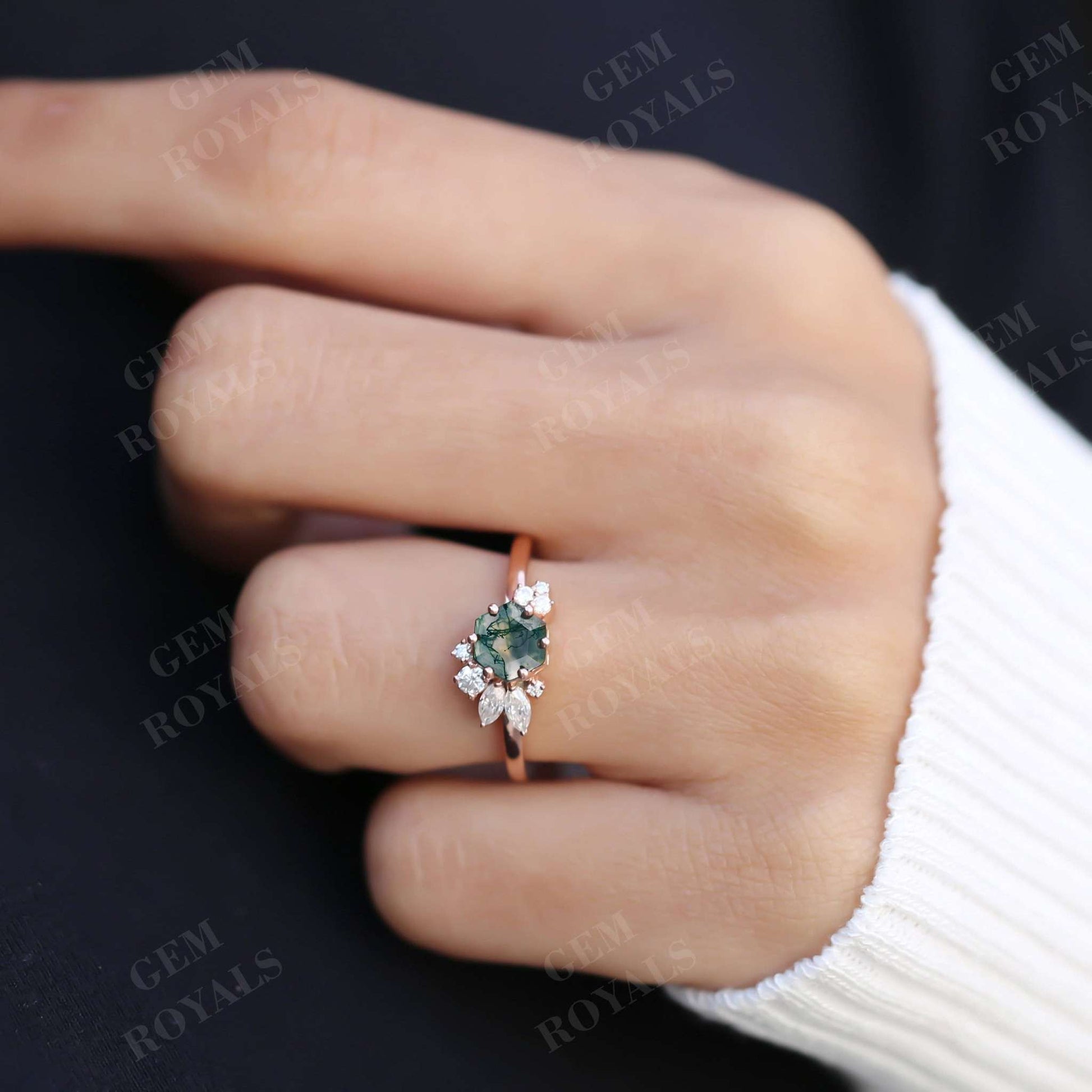 Art Deco Hexagon Cut Natural Moss Agate Engagement Ring